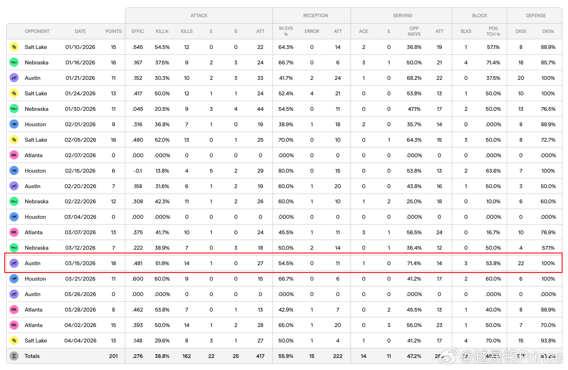 📌 20场比赛出场17次,总得分201分(417扣162中22失误25被拦+成功率38.8%/有效率27.6%,25拦14发;一传数222个15失误+到位率55.9%;173个防守,防守起球率85.2%)