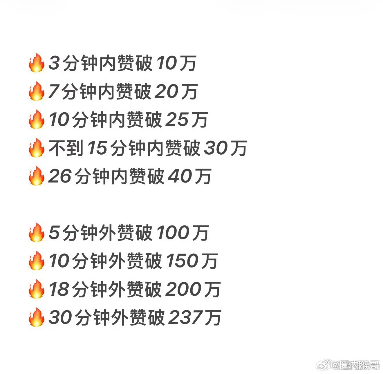 梓渝粉丝昨天晚上的测su这么变态的吗11月测还是30分钟外赞86万呢,时隔四个多月的这次直接来了个3分钟内赞10万、26分钟内赞40万,外赞是5分钟百万,30分钟237万,好牛逼的活粉数
