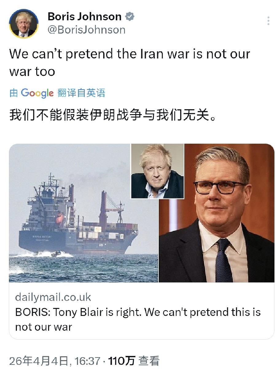 英国前首相鲍里斯·约翰逊北京时间4月4日写道:“我们不能假装伊朗战争与我们无关。”