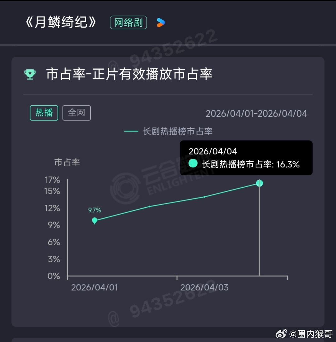 月鳞绮纪昨日云合占比16.3%已连续小跳涨三天,播放量大概在3700多w了,涨势非常喜人!