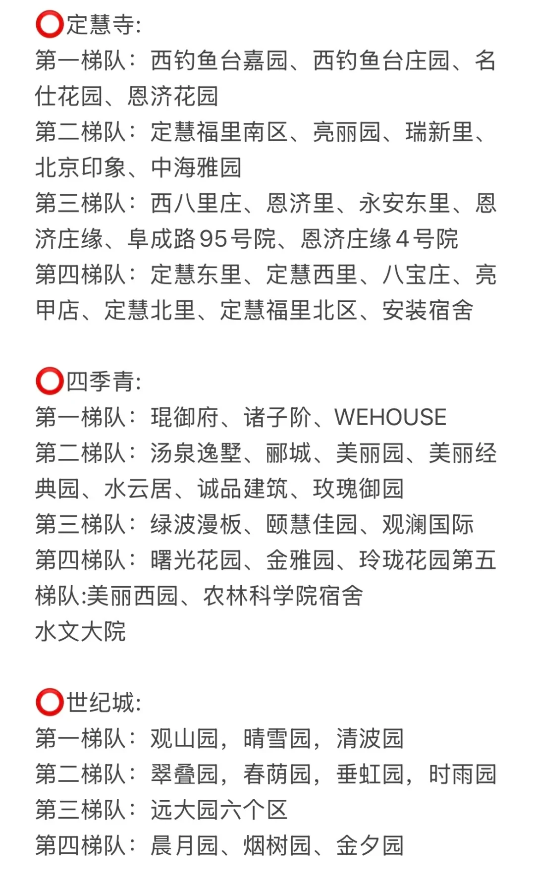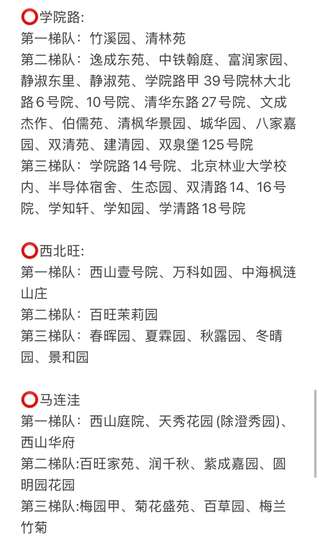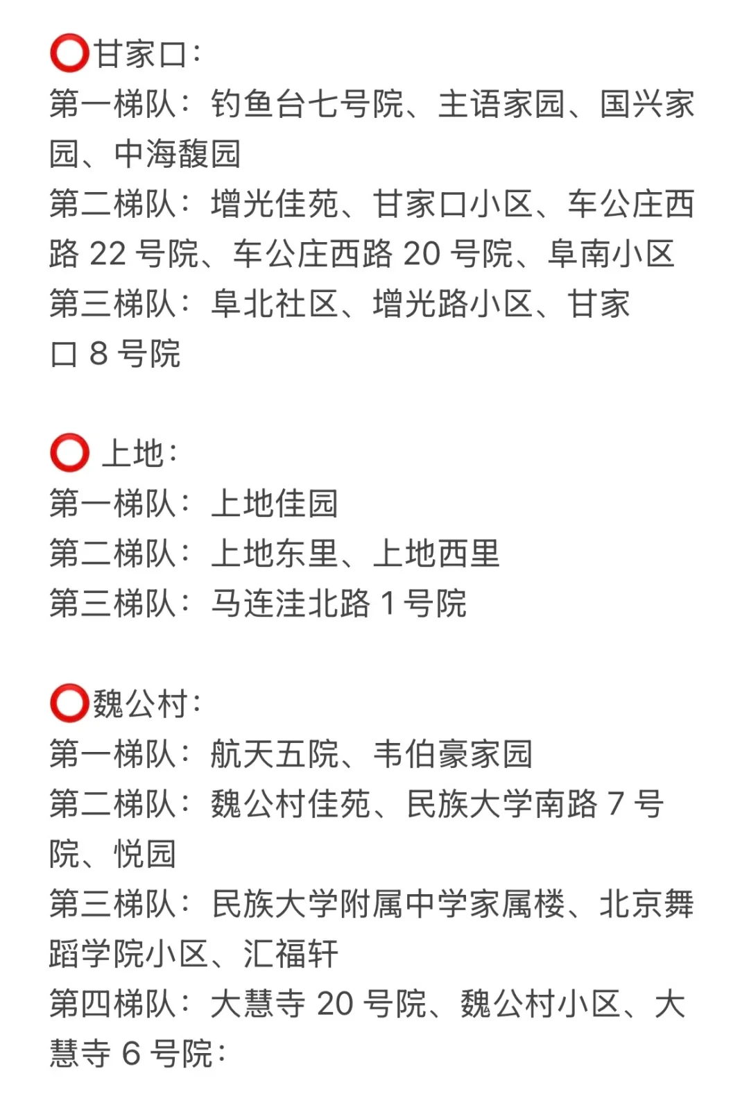 第二梯队:红联村、红联南村、红联北村、志强园、志强北园、志强南园、文慧园部分区域、学院南路各种号、新外大街各种号。