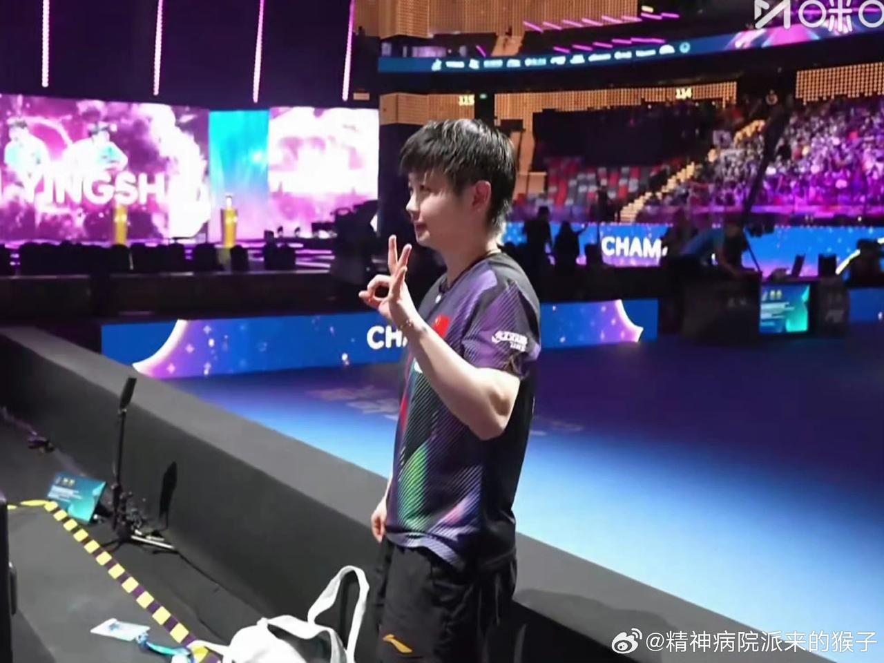 孙颖莎用手比个“三”[赞]!