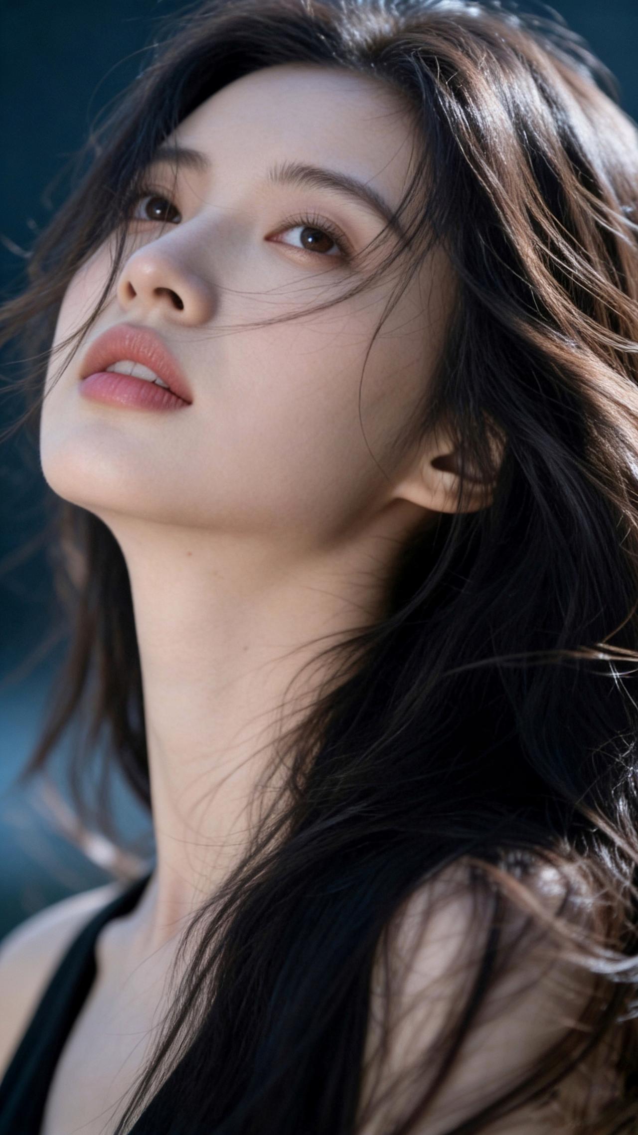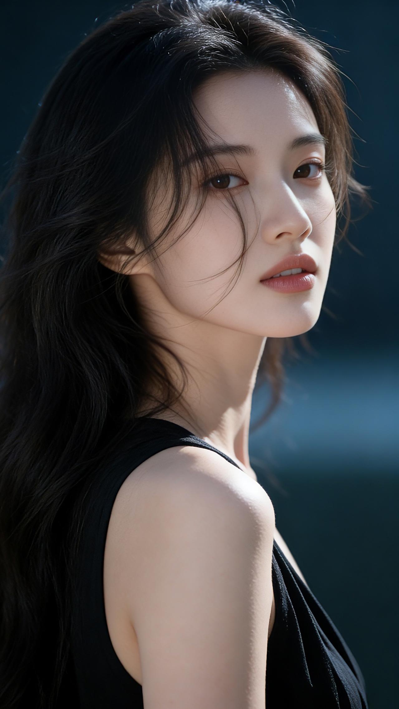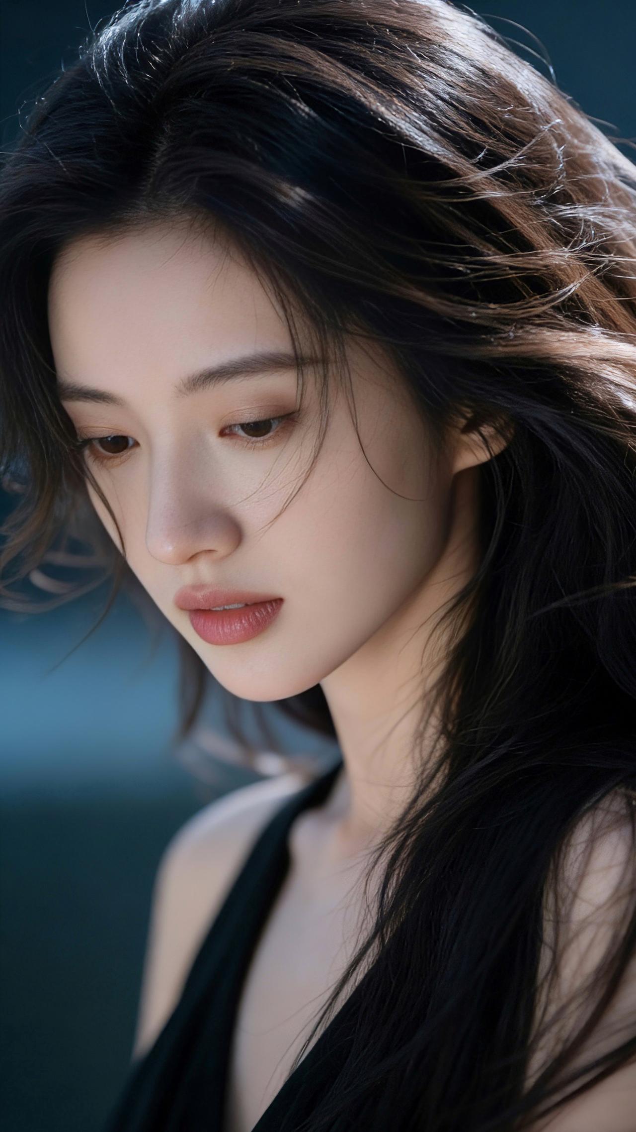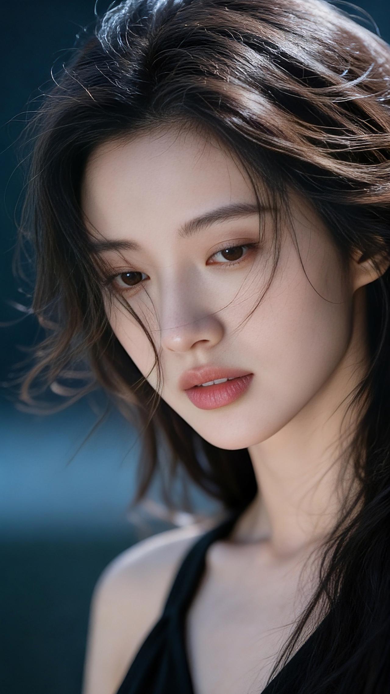 九帧同绘侧颜温婉仙!乌发如瀑垂落,黑吊带衬雪肌莹润。深蓝背景织静谧,微风拂发添灵动。眉眼藏星眸含情,唇角浅笑似春风,这东方美直戳心尖,一眼沦陷! 图片为A l辅助完成,请注意甄别!