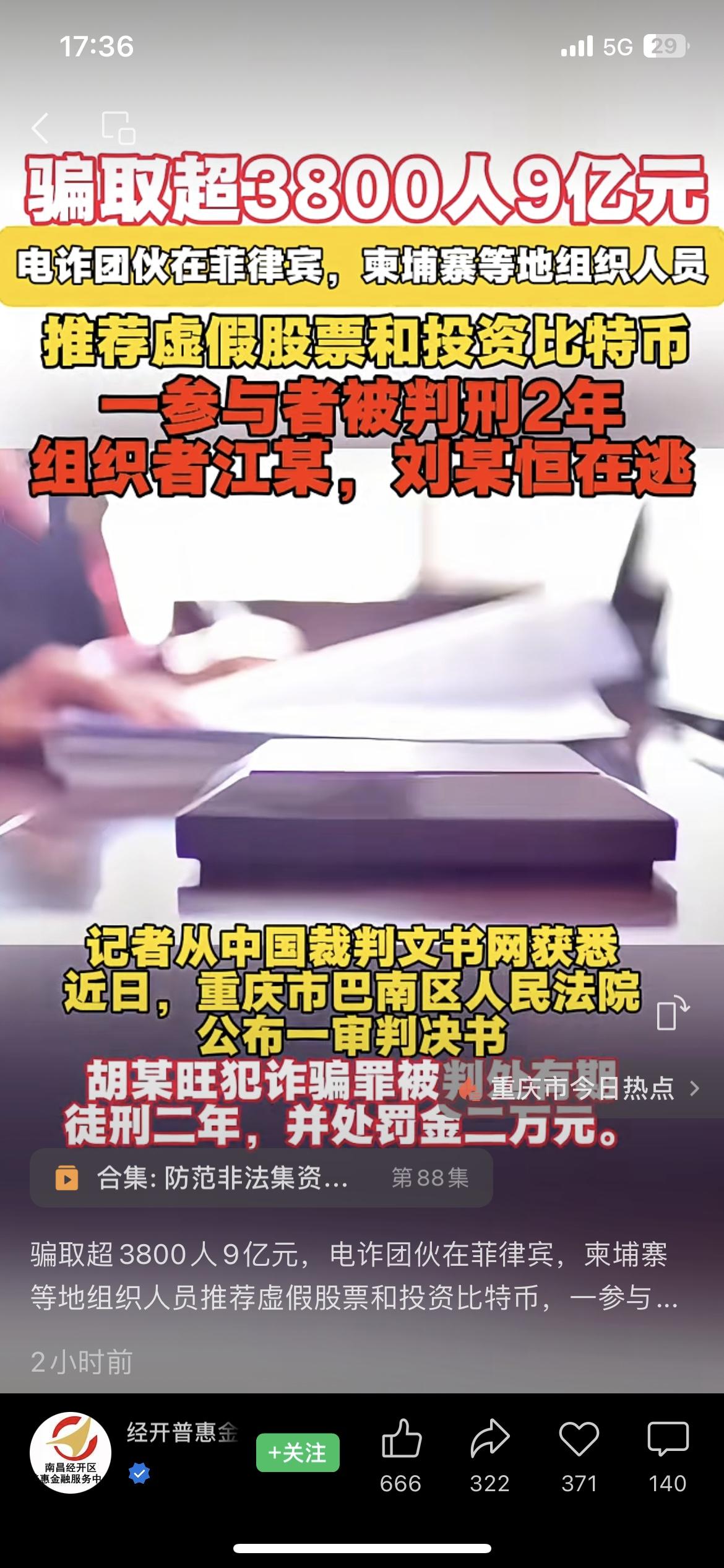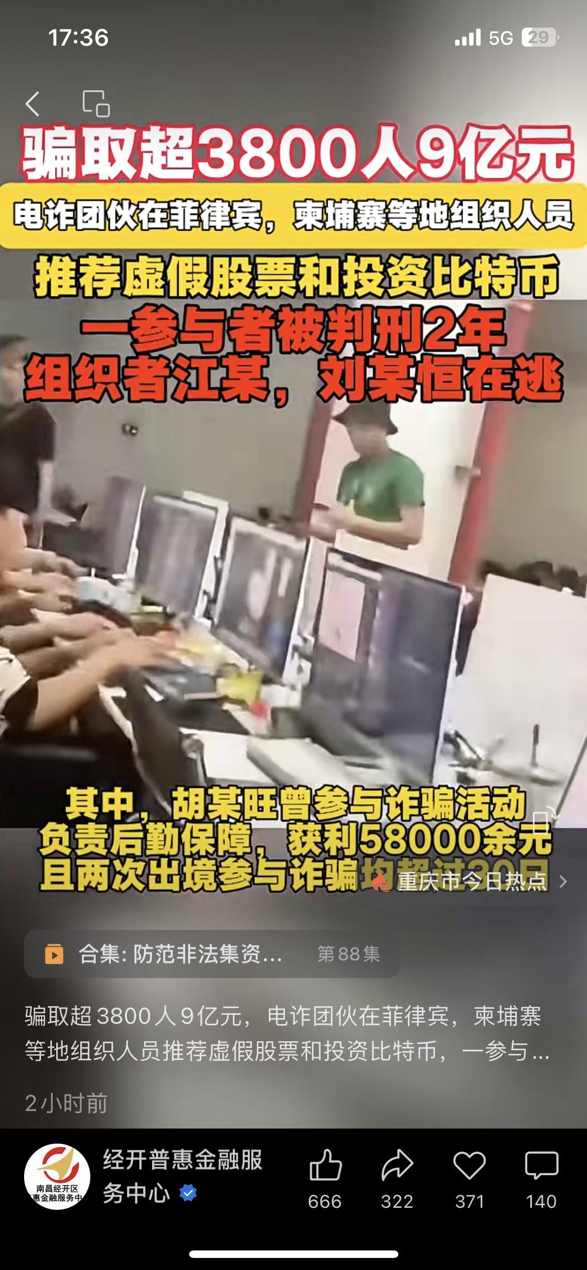 3800人被骗9亿!假股票、假比特币,全是杀猪盘 又一起特大杀猪盘曝光,团伙在境外遥控操作,用假股票、假比特币疯狂坑人,涉案3800多人、9亿元。 骗子包装成专业导师,天天晒收益、喊你加仓,承诺稳赚不赔,一步步把人套牢。记住一句:凡是网上陌生人带你投资的,全是骗局。不转账、不信守、不透露信息,才能守住辛苦钱。 电信诈骗 防骗提醒 杀猪盘