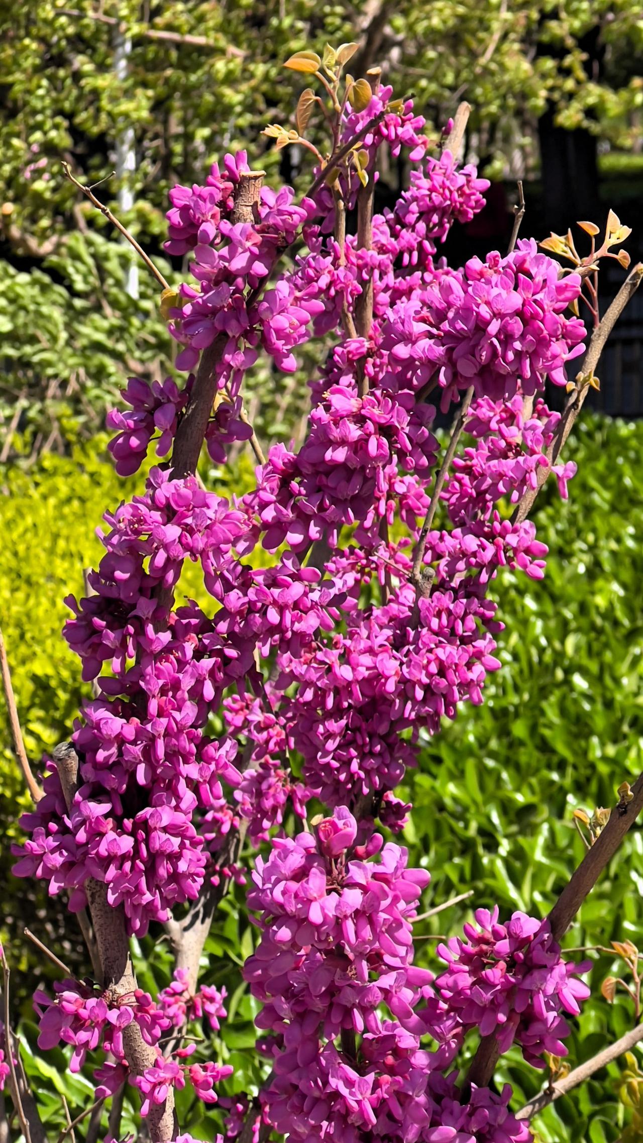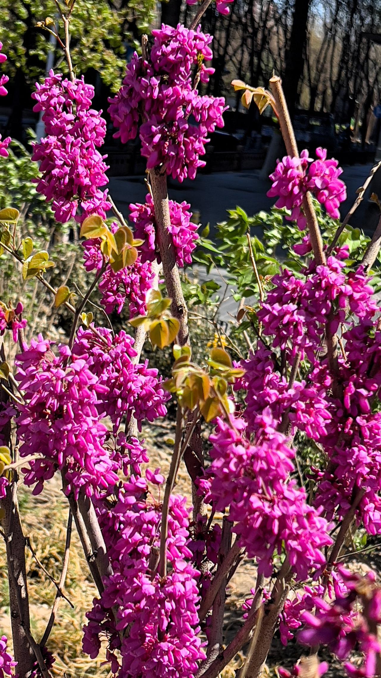 北京的四月,是紫荆最美的季节,是京城最靓丽的一道风景线。 这是我们小区路边的紫荆树,一眼望去,像条条紫色彩带在风中摇曳、飞舞,漂亮极了。 昨天我顶着大风,拍下了这美丽动人的紫荆花。整树紫荆开得热烈又温柔。紫荆树是先开花,后长叶子的独特魅力。 紫粉色的小花密密麻麻,顺着枝干层层叠叠往上攀,从粗壮的老枝到纤细的新条,全都裹在一片淡紫烟霞里。 阳光斜斜洒下来,花瓣薄得透亮,浅紫、玫红、淡粉晕在一起,像把天边的云霞揉碎了缀在枝头。 大风吹来,细碎的花影簌簌摇曳,落得满地浅紫,它不张扬,却美得沉静。 远远望去,一树繁花不见叶,只一团温柔的紫雾,在晴空下静静盛放,干净、烂漫,又带着几分不慌不忙的诗意。紫荆是我最喜欢的颜色之一。春日生活打卡季 春日赏花时刻