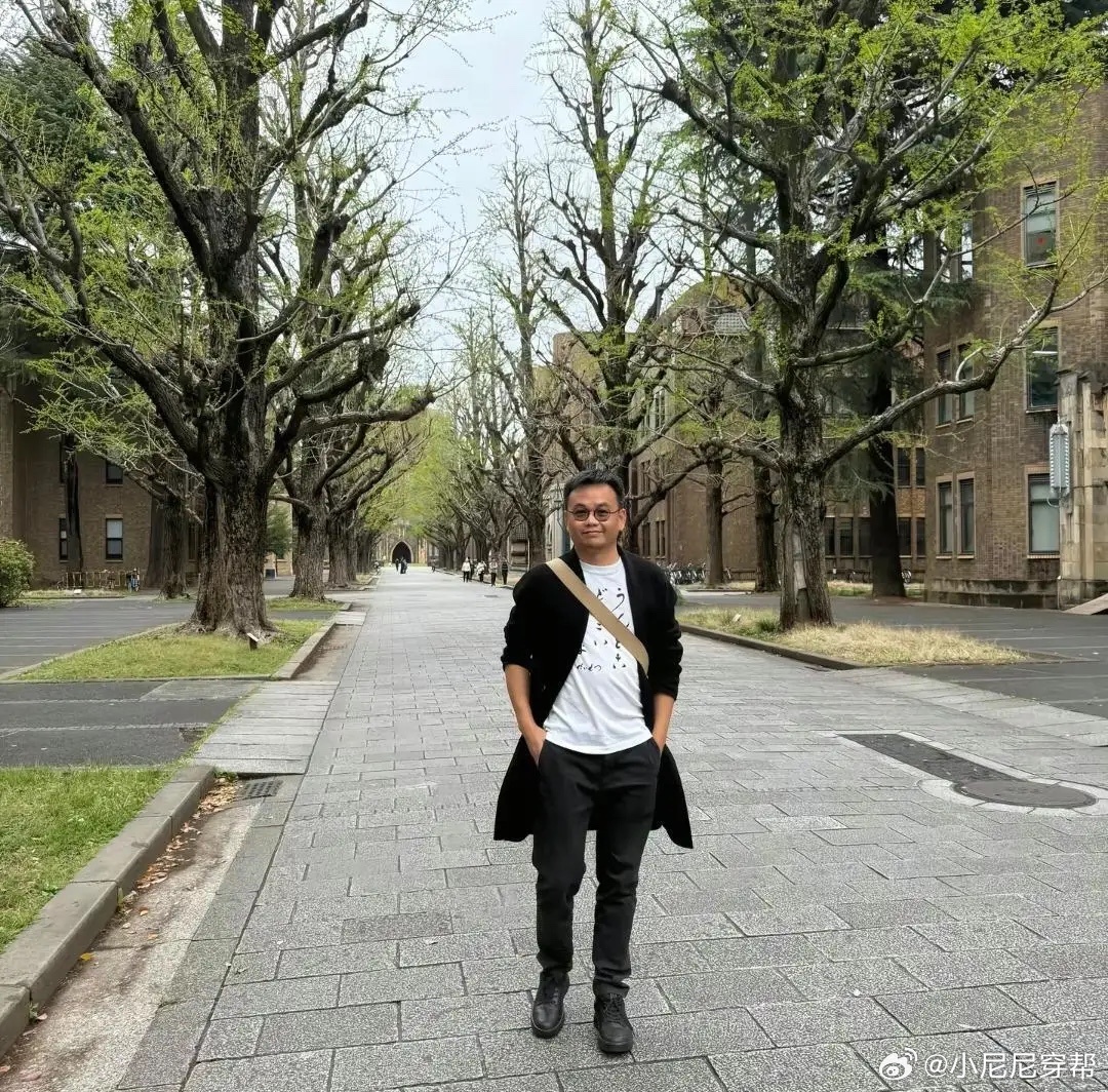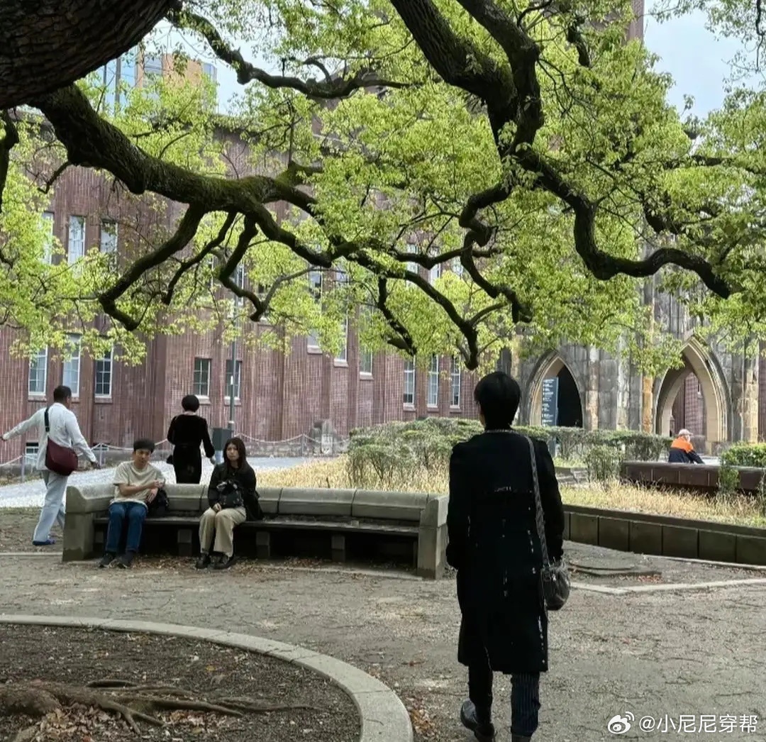 54岁袁立和老公梁太平在日本东京大学内赏樱花,她身穿黑色长大衣,背着名牌包,身材