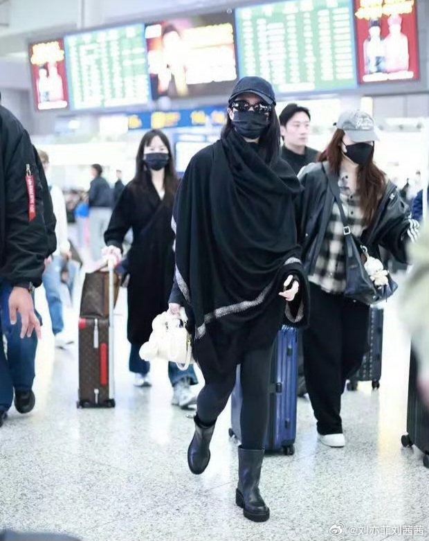 刘亦菲一身全黑造型亮相高铁,简约中透露出高级感,黑色披肩随性搭在肩头,边缘的银色细边点缀,打破沉闷又不失精致。内搭修身服饰,搭配黑色短靴,利落显瘦,整体穿搭将高级感与舒适感完美融合。