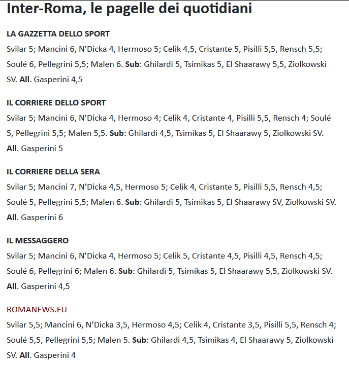 各大媒体的赛后平均评分:曼奇尼唯一及格,恩迪卡、切利克、忐忑、埃尔莫索、伦施都是