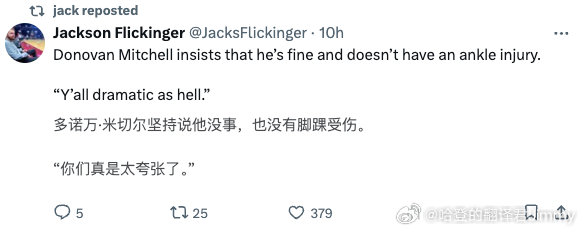 米切尔坚持表示自己没事,也没有脚踝伤。“你们也太夸张了。”