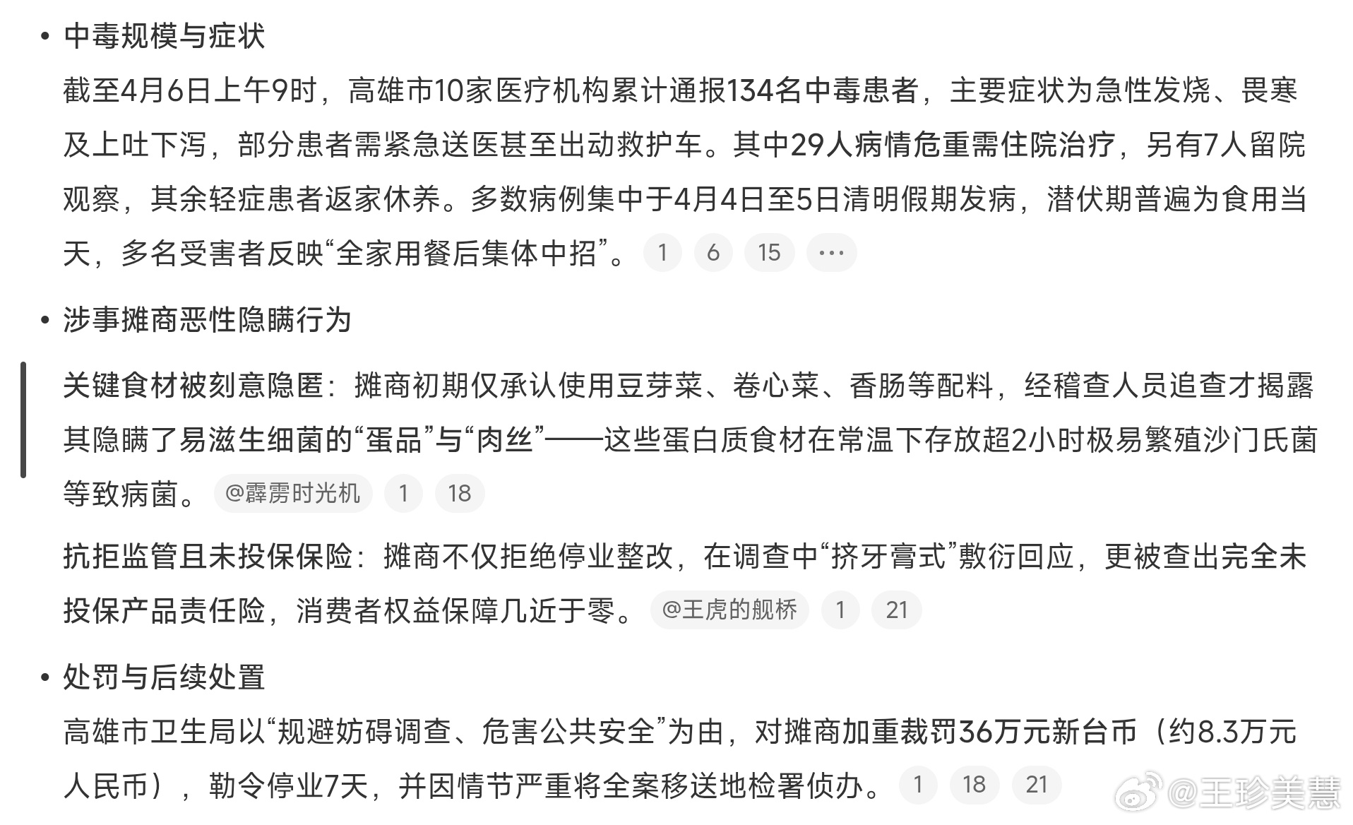 台湾春卷中毒人数增至134人摊主故意隐瞒食材问题,导致中毒人数越来越多大家在外吃