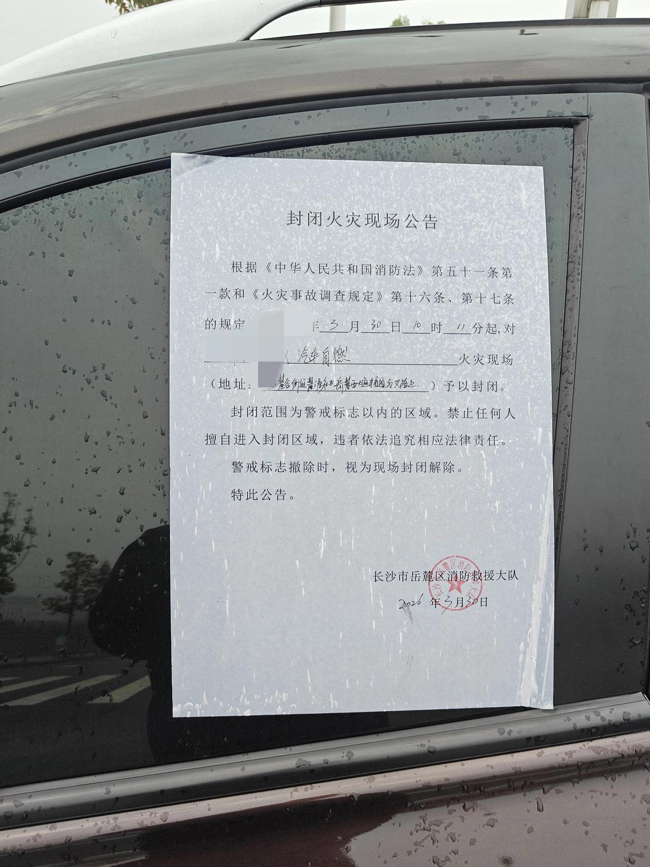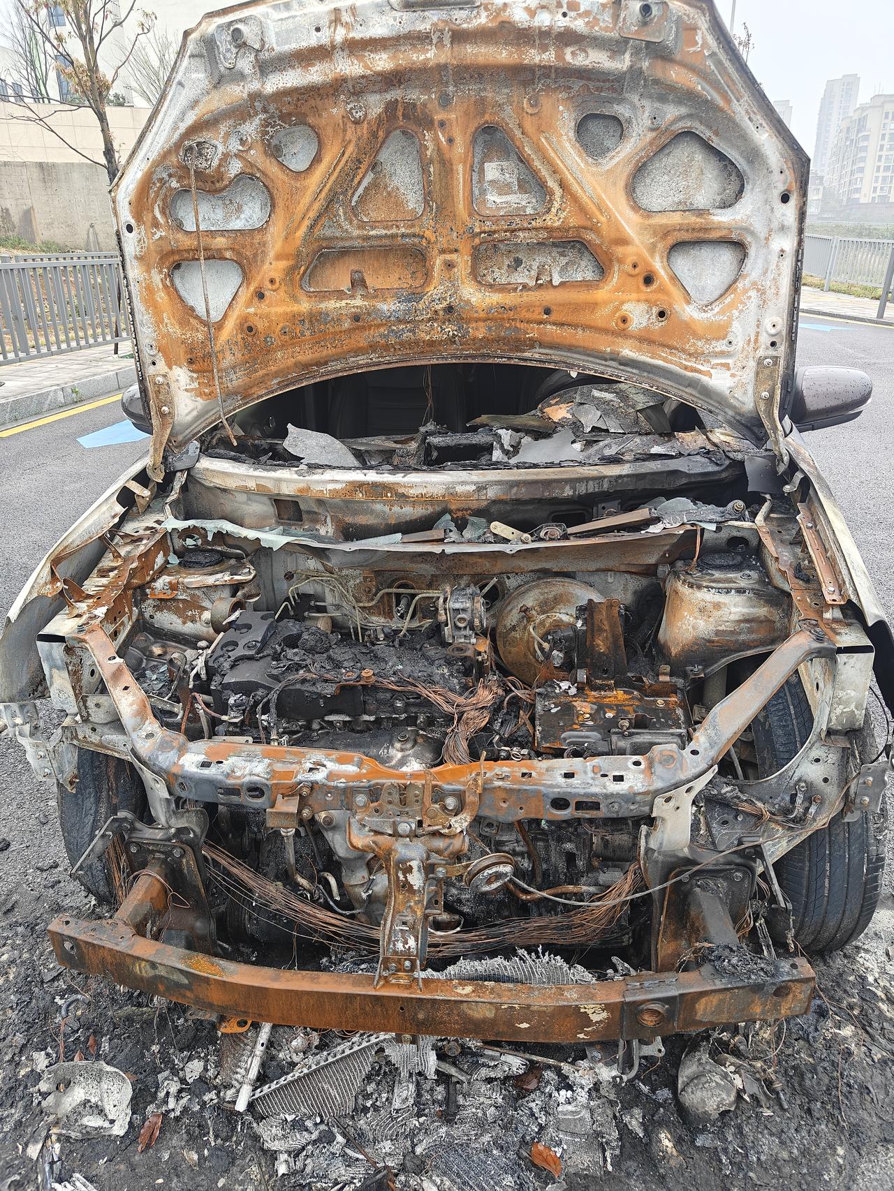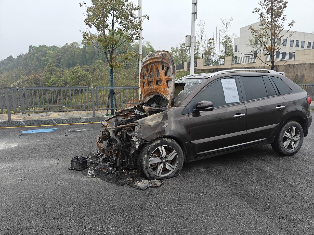 实锤岳麓大道旁自燃的车是一辆棕色雷诺SUV油车。 车子前部已烧得只剩骨架,内部零件清晰可见,经雨水冲刷,早已锈迹斑斑。 目前,该车已被消防部门贴上条子。车辆灭火后,车主一直未前来处理,不知是何原因?这种情况一般该如何处理呢?