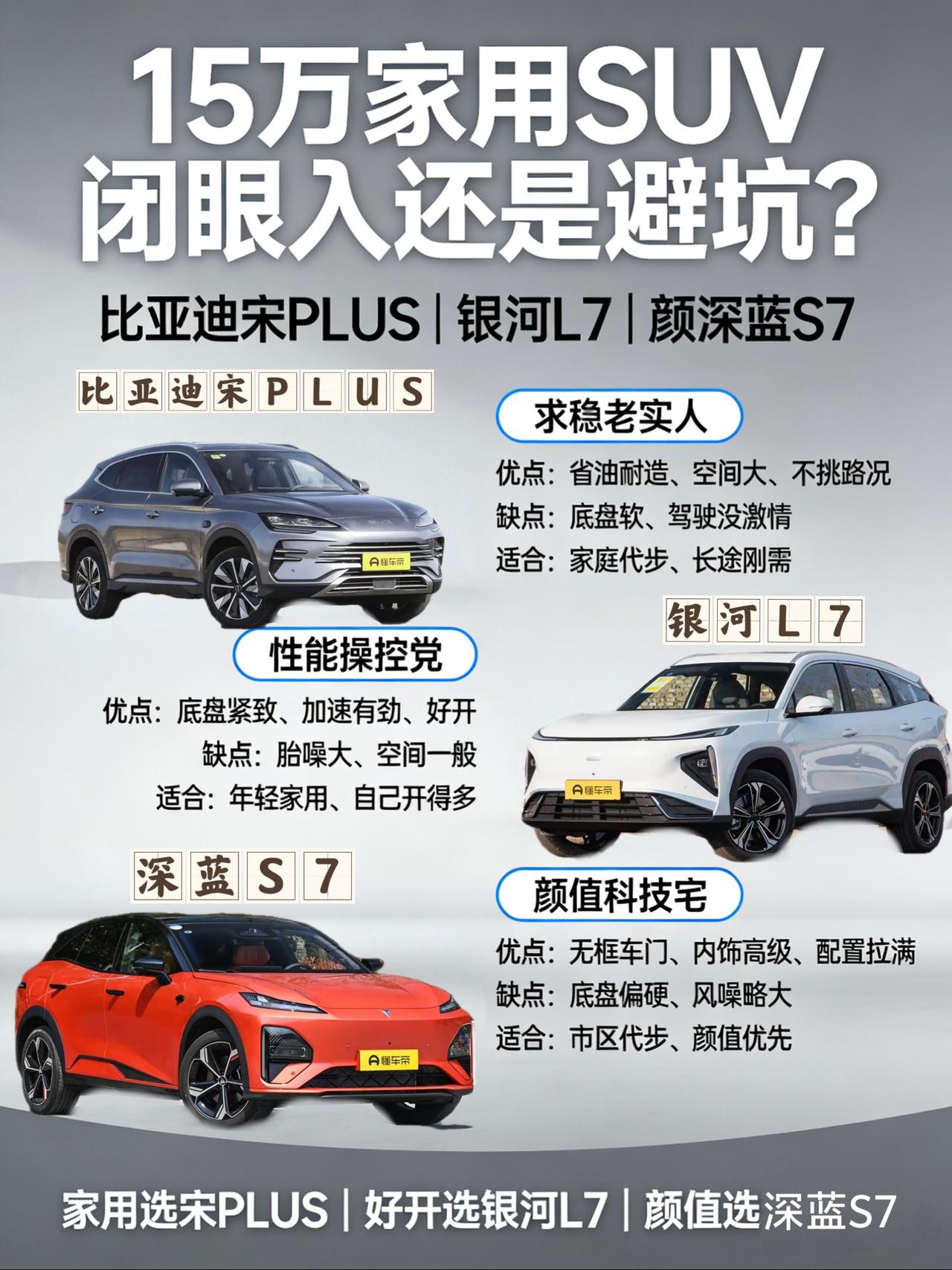 15万级家用SUV三选一:闭眼入还是避坑指南? 兄弟们,最近想买车的估计都看花眼了吧?15万左右的家用SUV,现在简直是“修罗场”。别光听销售吹,今天我就把目前市面上最火的三台车——比亚迪宋PLUS DM-i、吉利银河L7、深蓝S7拉出来唠唠。不整那些枯燥的参数,就说说真实体验和到底适合谁。 🚗. 比亚迪宋PLUS DM-i:求稳的“老实人” ✍️一句话点评:如果你怕修车、图省心,选它准没错。 📍真实体验:这车开起来就是“没脾气”,动力平顺,亏电油耗也就4个多油,确实省钱。空间大,后排地台纯平,带娃出门啥都能装。 📍槽点:底盘调校偏软,过弯支撑性一般,开起来没啥激情,像在开船。车机系统虽然流畅,但智能化程度跟新势力比,确实显得有点“老派”。 👉适合谁:家庭第一辆车、有里程焦虑、或者给长辈买。它就像家里的微波炉,不一定最炫,但绝对最耐用。 🚗. 吉利银河L7:想爽一把的“性能控” ✍️一句话点评:同价位里,它是为数不多能给你驾驶乐趣的。 📍真实体验:雷神电混+3挡DHT不是盖的,起步快,高速再加速能力比宋PLUS强一截。底盘偏欧系,紧致有韧性,过坑洼不散。 📍槽点:为了性能,胎噪稍微大点。后排空间虽然够用,但比起宋PLUS,头部和腿部余量没那么奢侈。品牌知名度虽然上来了,但保值率目前还干不过比亚迪。 👉适合谁:年轻小两口、对驾驶质感有要求、不想开“老头乐”的人。如果你觉得车不只是代步工具,还想偶尔撒个欢,选它。 🚗. 深蓝S7:颜值至上的“科技宅” ✍️一句话点评:要无框车门、要零重力座椅、要华为智驾?选它。 📍真实体验:外观最吸睛,无框车门+溜背造型,年轻人很难拒绝。内饰科技感拉满,副驾屏+零重力座椅,午休神器。增程版纯电续航长,市区代步基本不用油。 📍槽点:底盘调校偏硬,过减速带你得减速,不然屁股受罪。增程器启动时,声音隔绝做得一般,高速风噪也略大。品牌属于新势力,虽然背靠长安,但部分人还是会对长期可靠性有顾虑。 👉适合谁:都市白领、颜值党、对智能配置有执念的用户。如果你充电方便,主要活动半径在市区,它能给你越级的享受。 最终选购建议(真心话) 👉纯家用、跑长途多:比亚迪宋PLUS DM-i。闭眼入,虽然无聊但不会错。 👉自己开得多、想要点操控:吉利银河L7。性价比高,开起来不像十几万的车。 👉市区通勤、追求新潮:深蓝S7。配置给得最足,面子里子都有。 ✍️最后提醒一句:这三台车现在优惠力度都很大,建议都去试驾一圈。别光听我说,你的屁股和钱包会告诉你答案。【来自懂车帝车友圈】