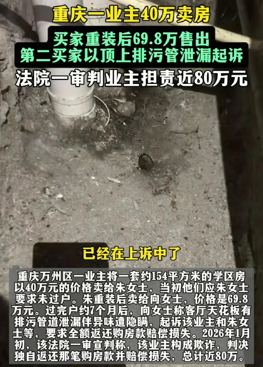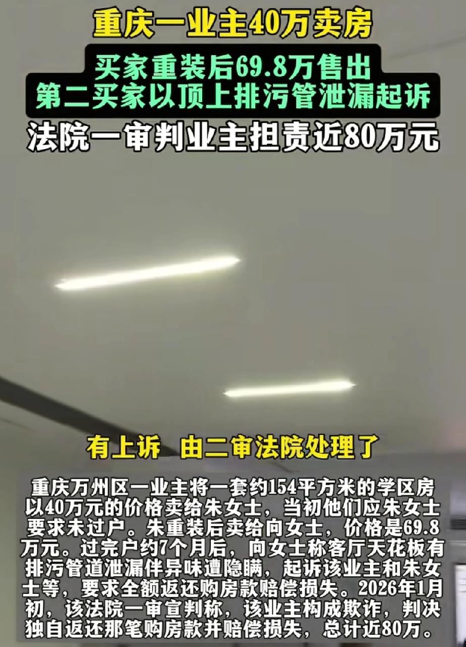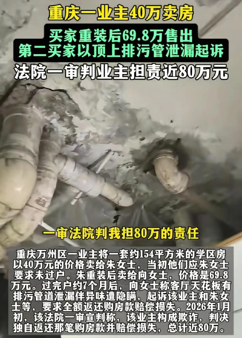 重庆一业主40万卖房,买家重装后69.8万售出,第二买家以天花板有排污管道泄漏起诉,一审判业主担责近80万。 重庆这事儿太离谱了!吴女士40万卖了套154平的学区房,买家重装后69.8万转手。可第二买家以天花板排污管道泄漏起诉,一审判吴女士家担责近80万。吴女士肯定觉得冤啊,房子才卖40万,这一判相当于房子没了还倒贴。 从法律上讲,《民法典》规定若原房主明知隐患却隐瞒,要担责;若交付后买方原因造成,原房主无责。这案子关键得看管道问题是交付前就有,还是交付后产生的。吴女士不服上诉,希望二审能给出公正结果,别让老实人吃亏。 重庆学府二手房 重庆西附学区房