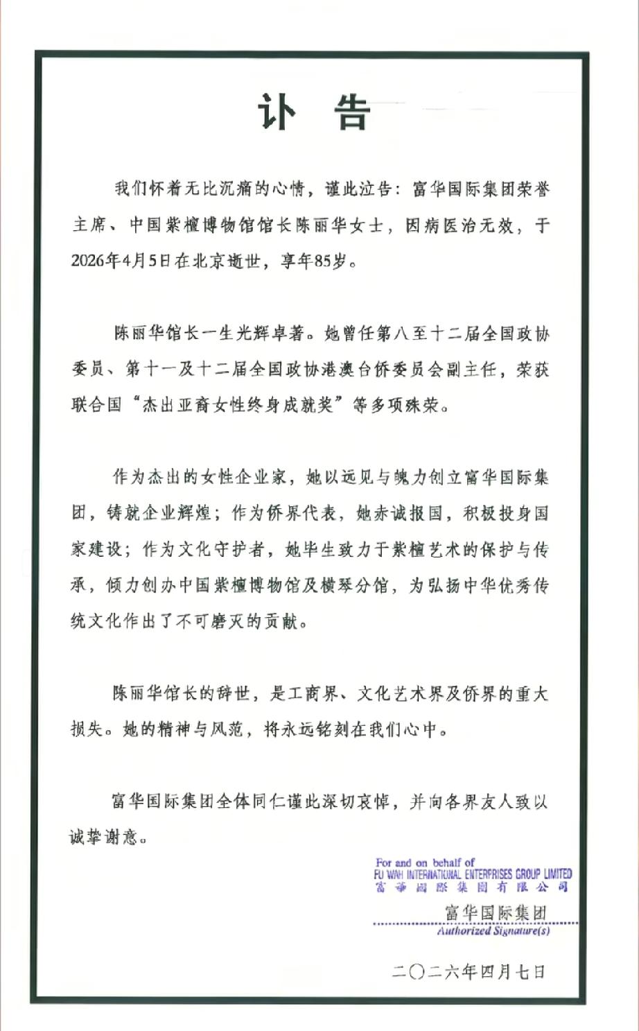 富华国际集团荣誉主席、中国紫檀博物馆馆长陈丽华逝世,享年85岁。 4月7日富华国际集团发布讣告,富华国际集团荣誉主席、中国紫檀博物馆馆长陈丽华女士,于4月5日在北京逝世,享年85岁。 陈丽华的一生颇具传奇色彩。她与比自己小11岁的“唐僧”迟重瑞的婚姻曾备受关注。1990年,二人因共同的京剧爱好,在一次京剧活动中相识并结为连理。她还是紫檀文化的守护者,创办了中国紫檀博物馆。她的离去是商业界和文化界的一大损失,愿她一路走好,留下的文化遗产能永远传承下去。