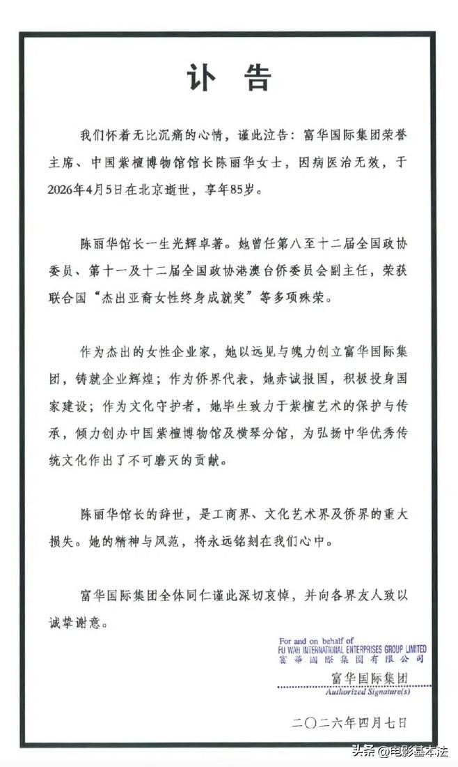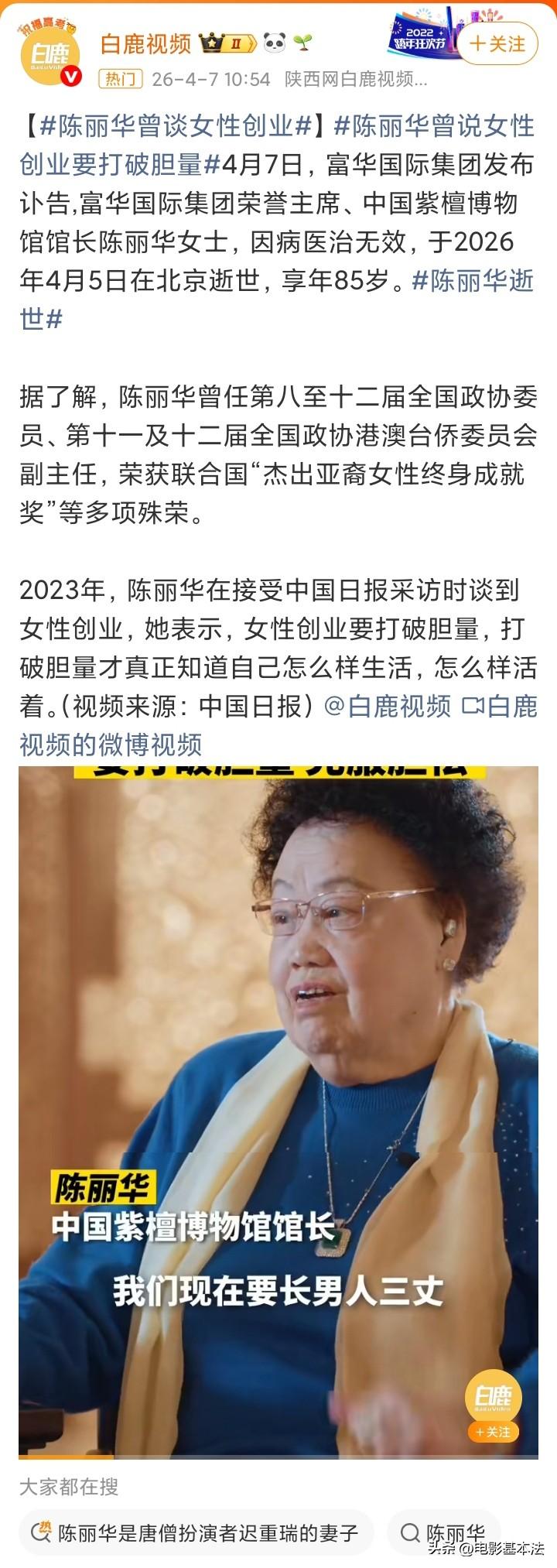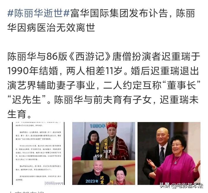 陈丽华,去世了! 4月7日,中国商界一个悲痛的消息传来,那就是著名女富豪、“唐僧”迟重瑞的妻子、知名紫檀收藏家陈丽华,已经因病于4月5日在北京逝世,享年85岁。 她是八旗后裔,她的一生充满了传奇,曾经的中国女首富、500多亿的身家、创办了北京第一家私营顶级私人会所长安俱乐部、创办了中国紫檀博物馆、据说北京王府井那里有条街是她的产业(年租金数十亿)、她收藏的紫檀故宫博物院都没有。 陈丽华担任过的职务包括第八至十二届全国政协委员、第十一及十二届全国政协港澳台侨委员会副主任等等,荣获联合国“杰出亚裔女性终身成就奖”等多项殊荣。 虽然她嫁给比她小11岁的“唐僧”迟重瑞让她充满了争议,甚至很多人认为她是“强娶”了唐僧,但是两人结婚后恩爱和睦几十年直到陈丽华去世打破了所有人质疑,虽然因为年龄问题两人未生育子女,但是这对姐弟恋,已然成为传奇。 如今一代传奇女性就此落幕,逝者安息,一路走好!