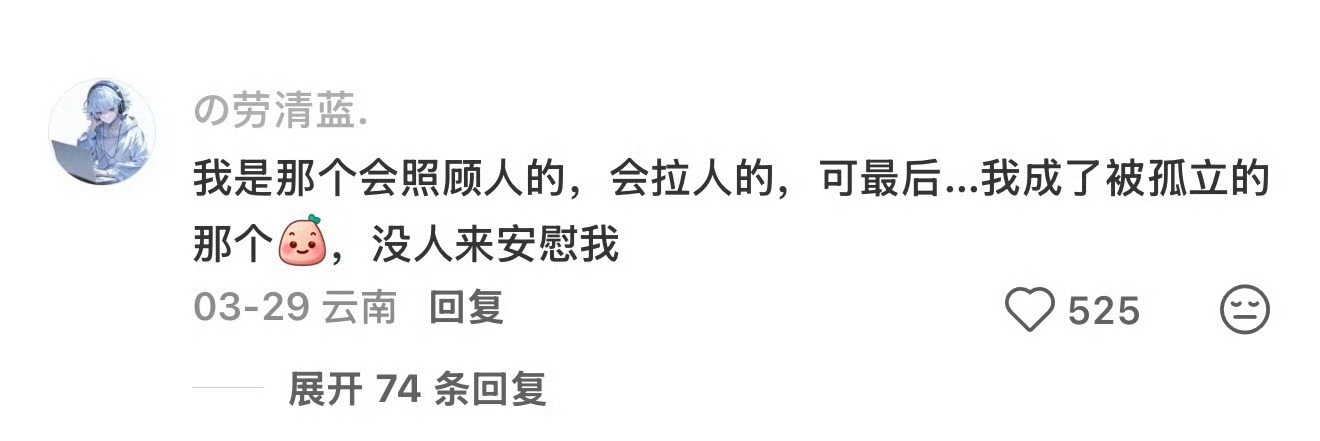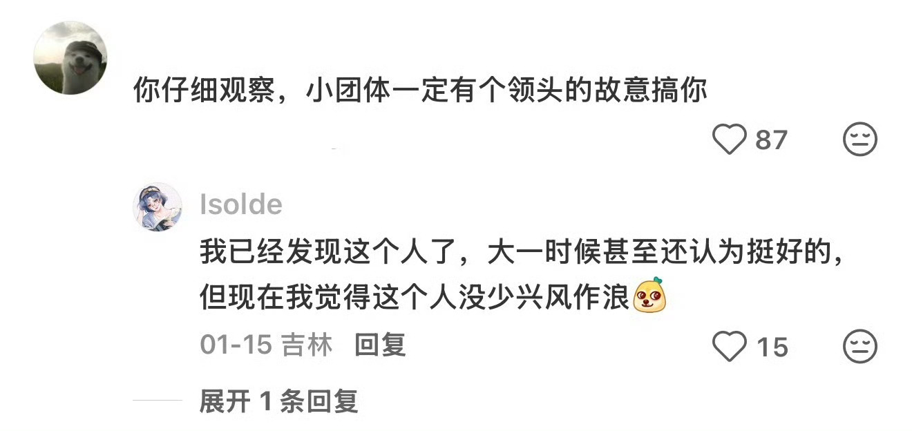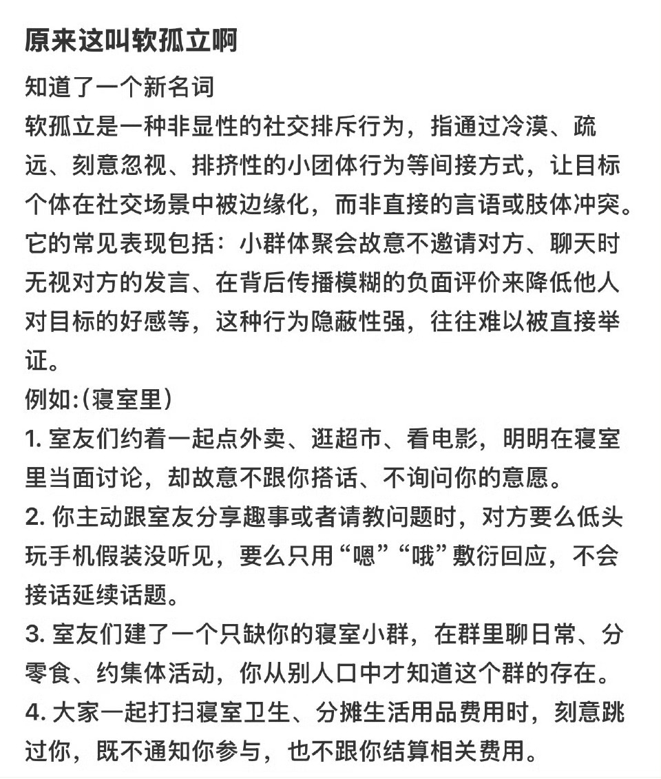 原来这叫软孤立啊你们遇到过软孤立吗?就比如一个寝室,就是表面上没有和你硬碰硬,但是会刻意孤立你,让你边缘化。其实我觉得这种时候,不要觉得委屈,融不进的圈子不必强融,去找适合你的圈子,在自己舒服的领域培养自己的自信心,不要太在意那些不重要的人和事,因为你的时间和精力很宝贵。而且你会发现,当别人觉得你不在孤独且自信,孤立你的自然而然会再来结交你。