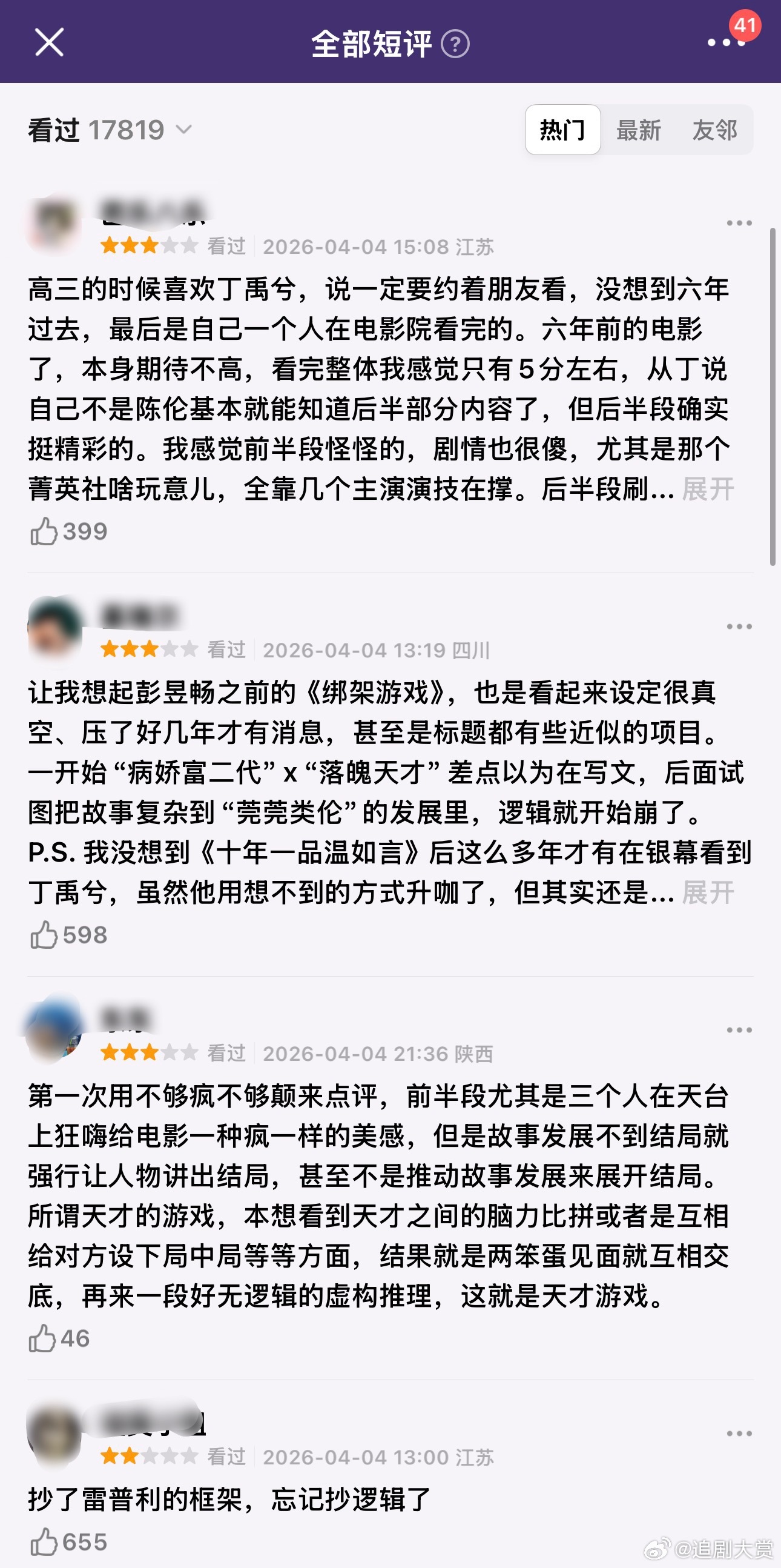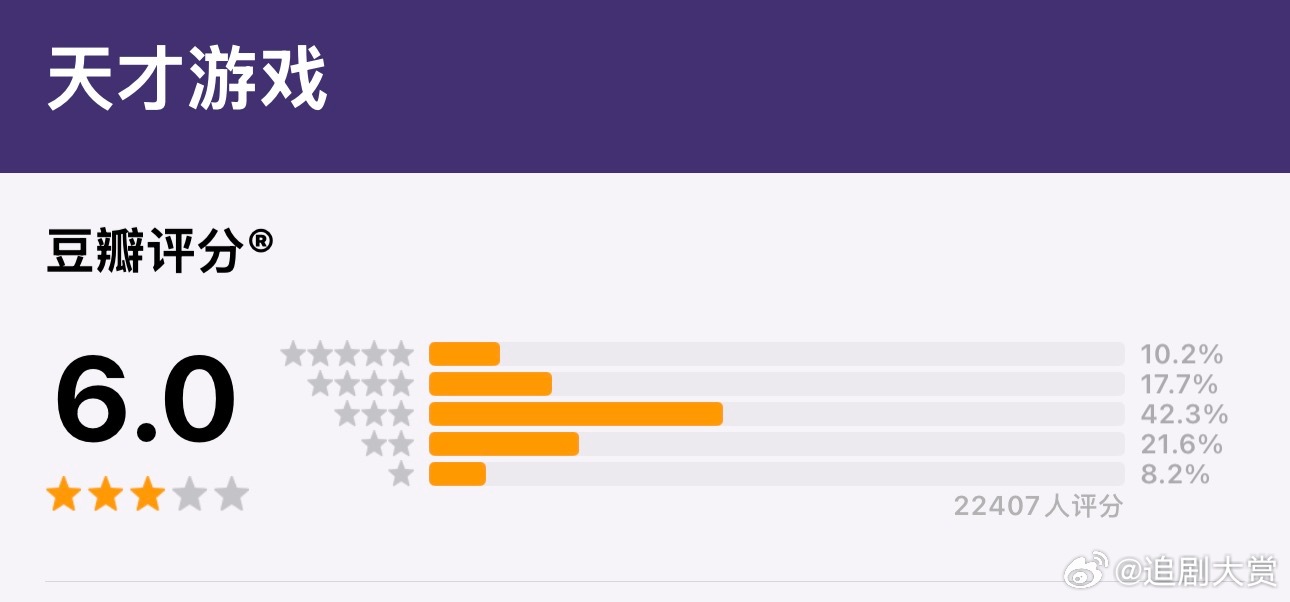 天才游戏豆瓣6.0 天才游戏豆瓣6.0,彭昱畅、丁禹兮主演电影《天才游戏》豆瓣开分6.0,两万多人参与打分,其中三星打分人数最多,占比超40%,你们觉得这个分数合理吗?
