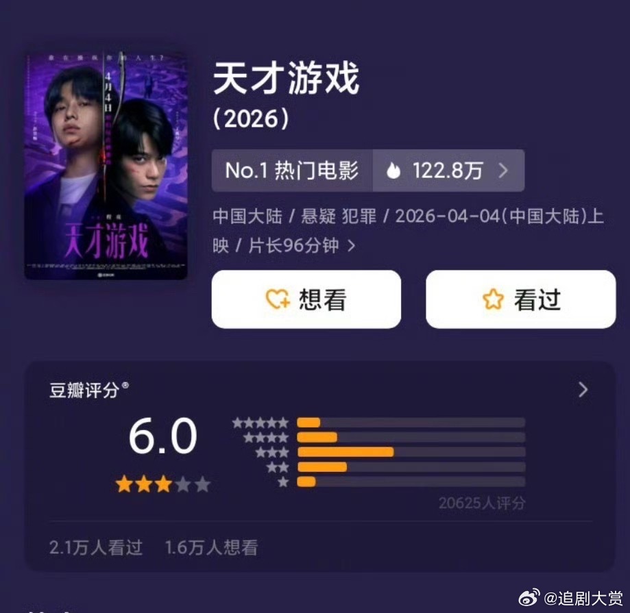 天才游戏豆瓣6.0 天才游戏豆瓣6.0,彭昱畅、丁禹兮主演电影《天才游戏》豆瓣开