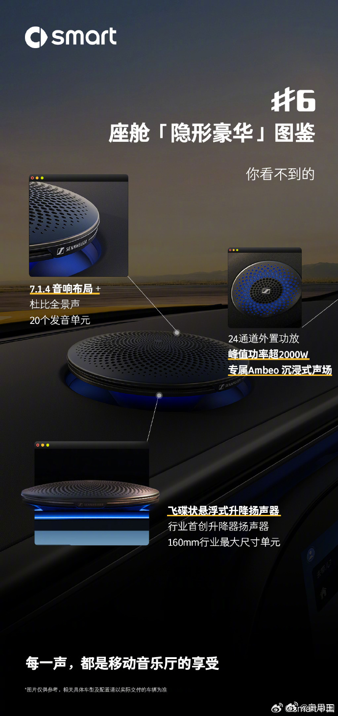 你愿意为车内的仪式感买单吗看到smart精灵6号内饰图,我第一反应是:终于有车不跟我聊参数了。它把重点全搁在氛围和质感上——先说那个森海塞尔音响,每个车门真三分频,高、中、低频各司其职,这配置放在车上,耳朵直接“怀孕”,仪式感给得够直接。