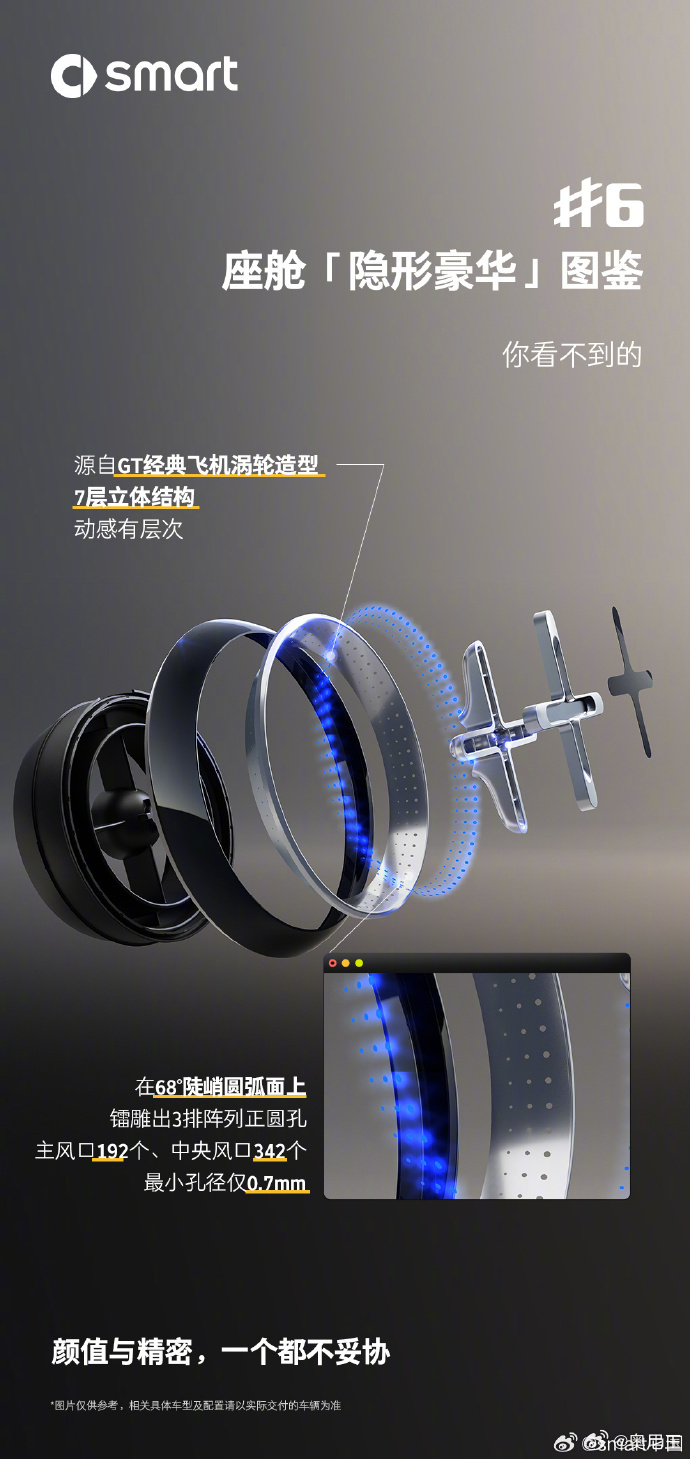 再看星光涡轮出风口,GT飞机涡轮造型加氛围灯,风里带着战斗味又透着一股温柔,晚上开车估计会多看两眼。最后是座椅,零压一体式,金属膜片工艺加打孔复刻出专属纹样,古典和时尚同时“坐”进去。这车不跟你拼续航,拼的是你想不想多待一会儿。