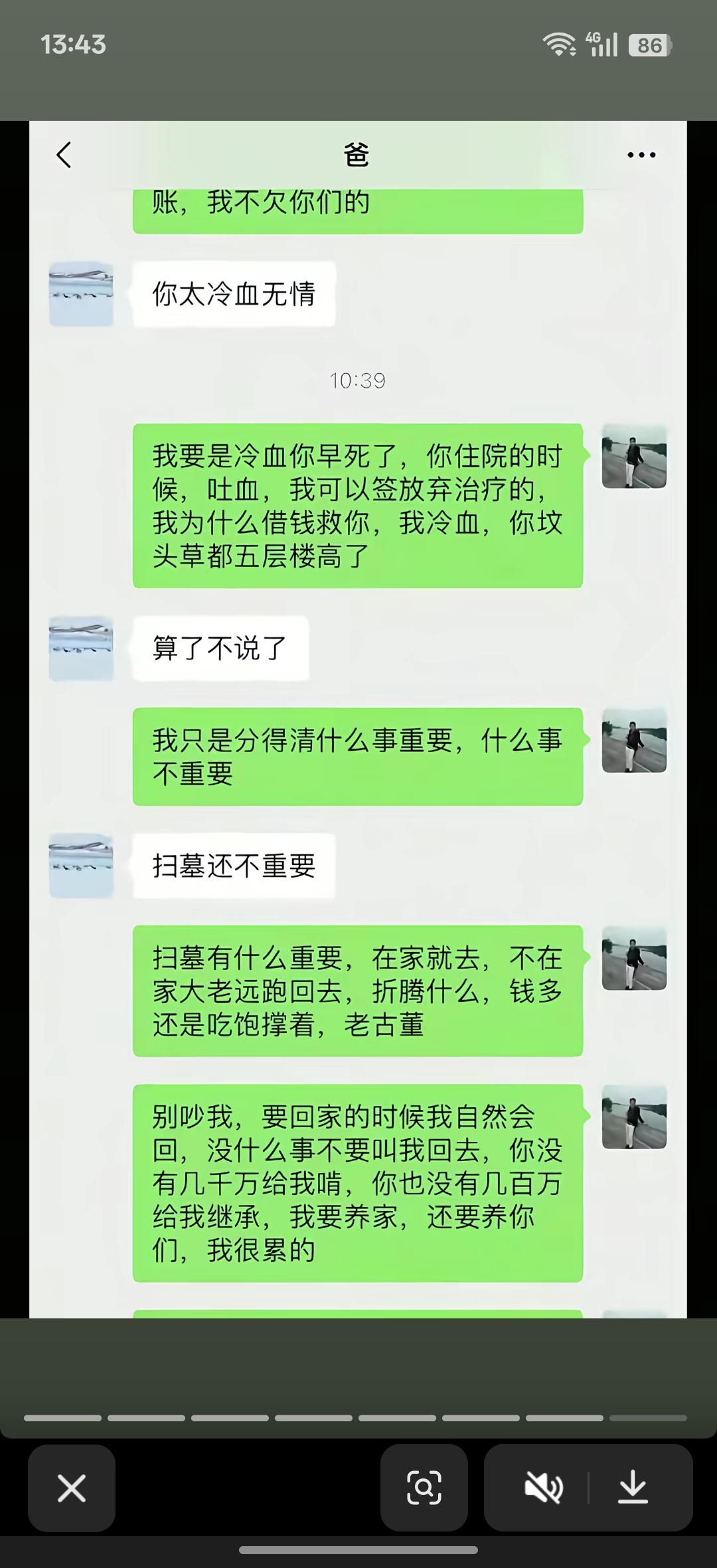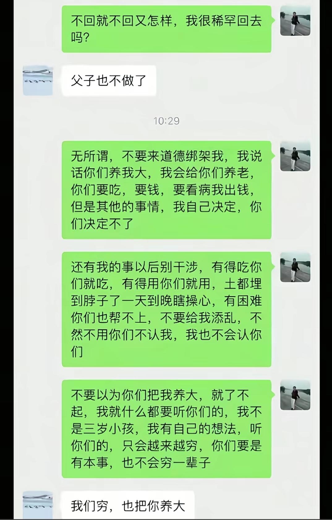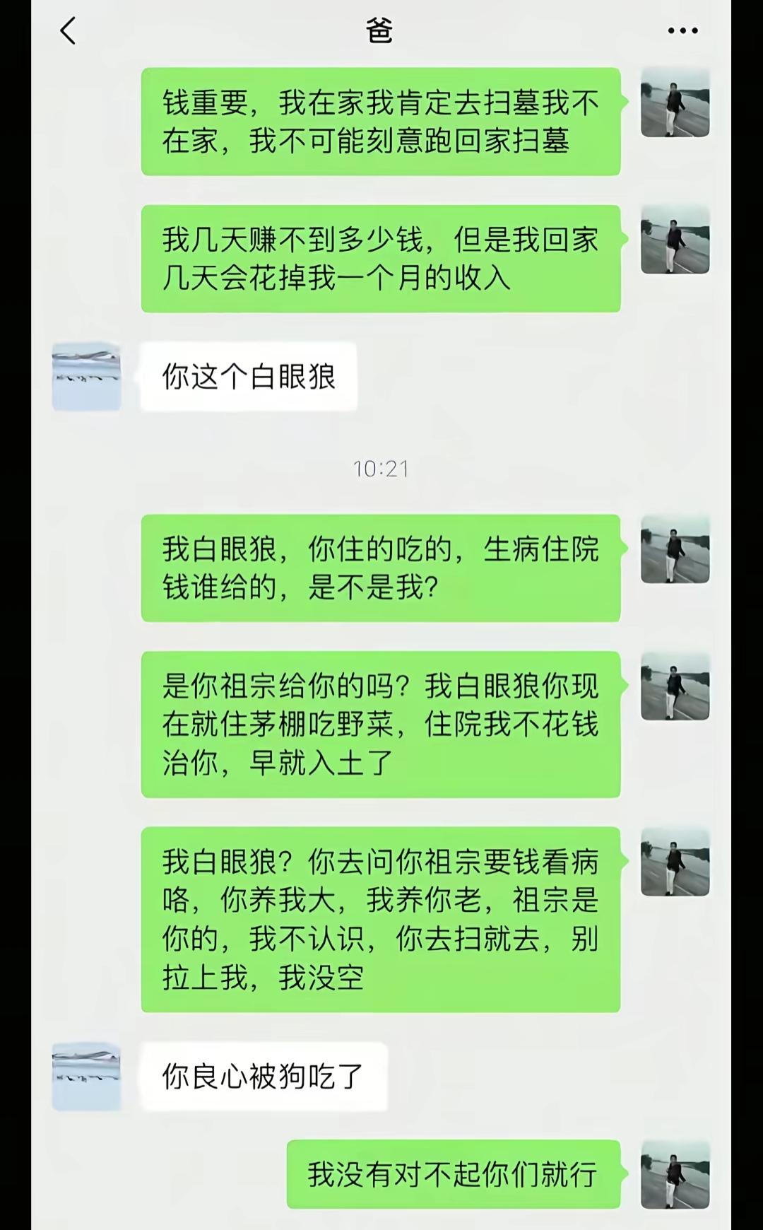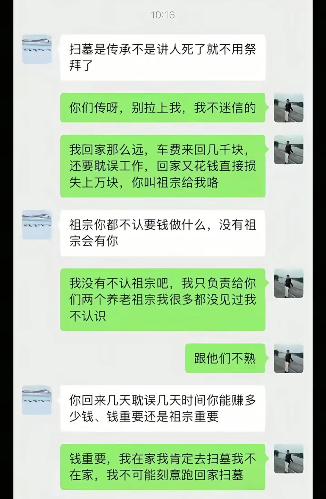 在网上看到一对父子为了是否回家扫墓吵得不可开交。父亲要求儿子回来给爷爷奶奶扫墓,儿子不回来,他要上班,而且回家一趟要花钱。他觉得人死了,没必要搞这些仪式,说他父亲扫了一辈子也那么穷。父亲说儿子冷血,白眼狼。儿子则反抗,语言相当粗糙。父亲没办法,说不过儿子,说要断绝父子关系,没想到儿子硬刚。 全程儿子强势又直白,父亲在这场对话中是处于弱势,又无可奈何。 但是,评论区却都赞成儿子的做法。儿大不由娘大概就是这样吧。 扫墓到底是怎么陋习还是应该坚持下去的孝道?