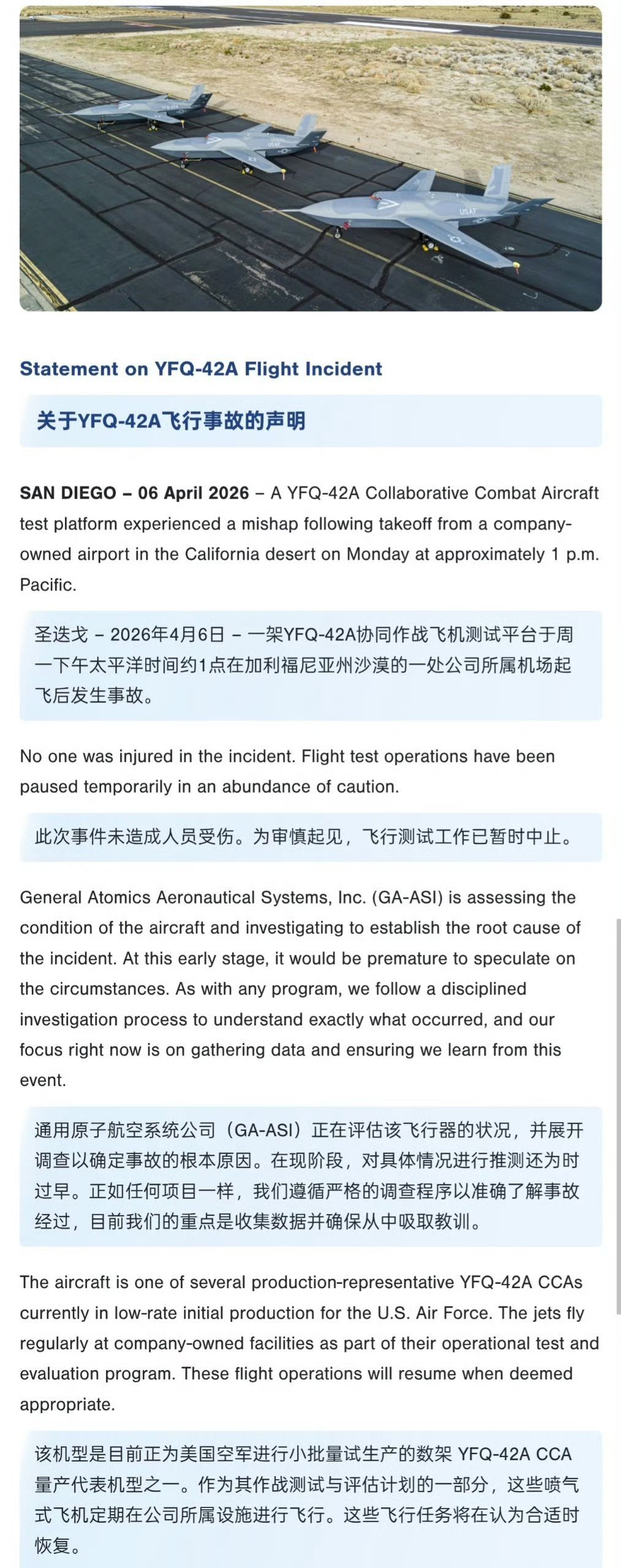 通用原子公司 GA-ASI 的一架 YFQ-42A 无人机测试机,于周一在加州沙