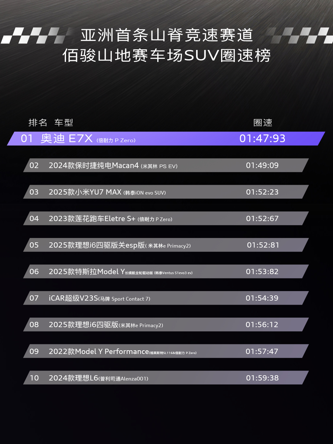 奥迪E7X以01'47"93的圈速成绩,登顶亚洲首条山脊赛道佰骏山地赛车场SUV圈速榜。