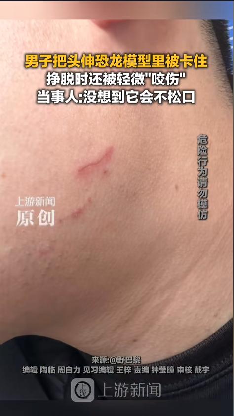 “好奇心害死猫!”近日,吉林,一男子游玩时发现,旁边的恐龙模型,嘴一张一合的,十分的有趣。男子童心未泯,想试一下什么感觉,就把头伸了进去,没想到恐龙竟然咬着就不松口了。网友:弥补了恐龙不能咬人的遗憾! 出去玩,见着会动的模型,不仅是小孩子充满了兴趣,想上去摸摸试试,连有的大人都抵抗不了,也想上手。不过,可不是什么模型都能碰的,搞不好受伤的就是自己。 据媒体4月7日报道,事发当日,男子正在景区游玩,景区里摆了很多恐龙模型。而且为了让模型更逼真,制作者们在恐龙的爪子和嘴部,都安装了驱动装置,让它们得以动起来。 男子在经过时,看着这些模型十分好奇。这个模型,嘴巴一张一合,左右摇摆,看的男子心里直痒痒。最重要是,男子比量了一下,高度刚刚好,自己能比较轻松的把头伸进去。 机不可失,男子当即就把头伸进了恐龙模型嘴里,可是没成想,恐龙咬下去之后居然不张开了。男子这个难受啊,只能自己双手用力,使劲儿把恐龙嘴给掰开,这才逃脱了出来。脸还被恐龙模型给咬伤了,肿了两道。 网友看后表示,这回值了,达成成就,恐龙嘴下逃生第一人!以前只见过小孩子好奇,伸手去碰这些东西被卡住的,大人被咬,还真是第一次,可算是开了眼了!文明游玩,从你我做起!这个反面教材可学不得! 信息来源:《4月7日(采访),吉林,