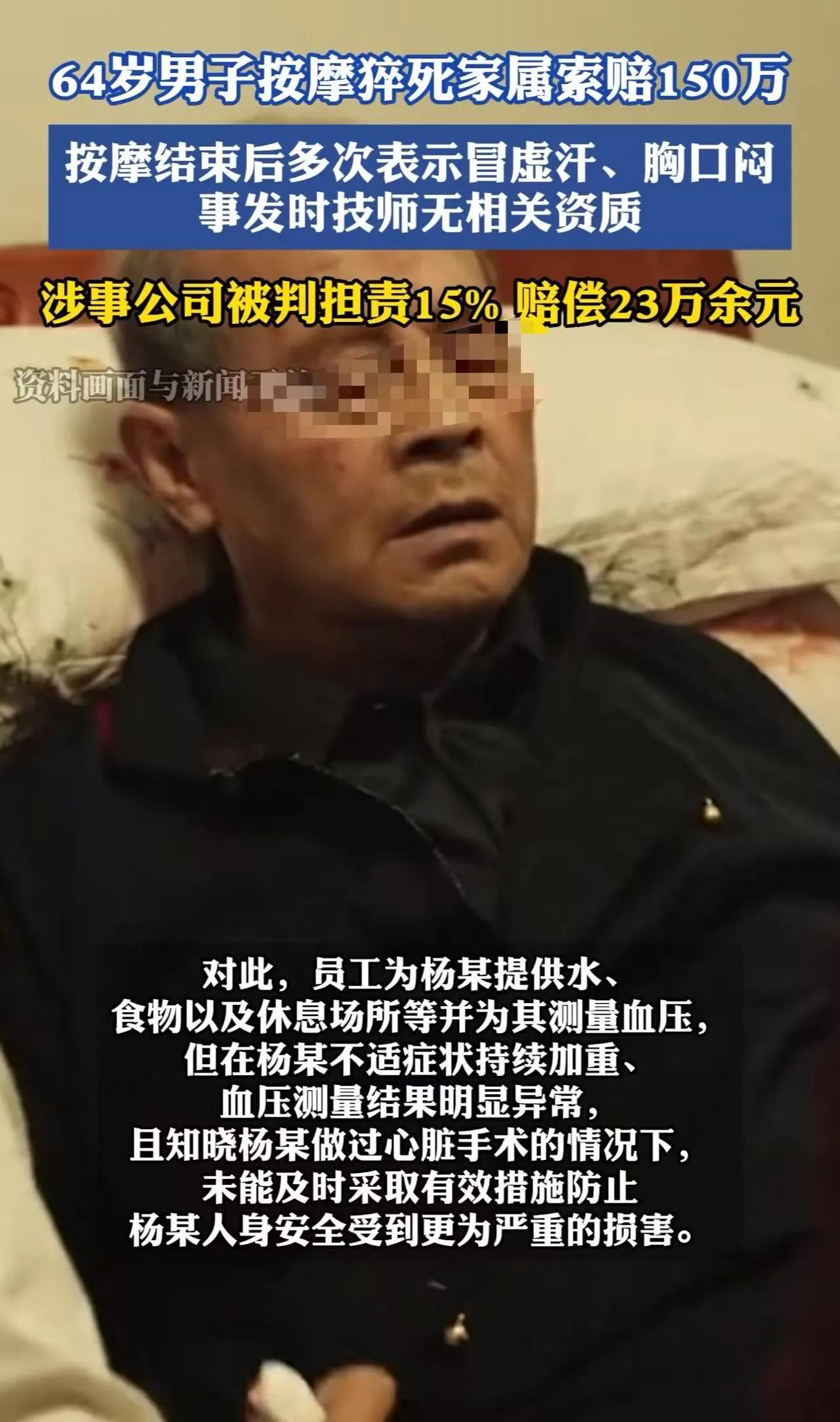 64岁、有两次心脏搭桥史、还敢一口气点4个项目、还非要两个技师同时上手、北京这位杨大爷把身体当赌注,最后倒在按摩店,家属索赔156万,店家喊冤,这一局从一开始就带着火药味。 2024年8月1日下午,人进店很正常,点单不正常,“背+药、中焦+药、腿部+摩奇+药、三排”,项目一口气铺满,再加“双技师同时操作”,强度直接拉满,身体底子却是心脏搭桥两次,这组合,本身就危险。 过程中已经出信号了,一会喊冷,一会喊热,空调来回调,这种冷热交替不是小毛病,是循环系统在报警,但现场没人把它当成“必须停”的红线。 项目结束,人去厕所,回来脸色发白、拉肚子、冒虚汗、胸闷,这一串症状已经不是“累了”,这是典型的急性风险信号。 技师开始忙,端水、测血压,高压60多,这个数值已经低到危险线以下,可处理方式却停在“饼干+淡盐水”,然后通知店长,动作有,但力度明显不够。 店长来了,知道他有心脏病史,问要不要去医院,对方拒绝,就停在这一步,没有联系家属,没有强制送医,这一段处理,直接卡在“问过了”这个层面。 很快情况崩了,喘不上气、抽搐,这才打120,现场又是掐人中又是心肺复苏,可时间已经被前面消耗掉,救护车到,人已经没了生命体征,鉴定结果是猝死。 事情到这一步,本来就够沉重,可后面更复杂,家属起诉,要求156万,理由很直接,首次不适没重视、知道病史没升级处理、没联系家属、没果断送医,安全保障义务没做到位。 店家反击也很硬,大爷自己有病还来,拒绝送医在先,我们已经照顾、已经劝、最后也打了120,这不是我们造成的。 舆论直接分裂,一边说“自己赌命怪谁”,一边说“明知有病还接单,资质还不全,这是拿命赚钱”,还有人看得更冷静,双方都有问题,只是责任比例怎么分。 法院给了答案,关键点很清晰,一名技师当天没有相关资质,这是硬伤,其次在已知严重病史、出现明显异常、血压极低的情况下,没有更果断措施,没有联系家属,没有立即送医,这就是应急处置不到位。 但另一边也没放过,杨大爷是完全行为能力人,知道自己病重,还选择高强度项目,还拒绝送医,这属于重大过错。 判决结果落地,85%责任在个人,15%在店方,赔23万多,二审维持。 这一刀切得很清楚,命是自己的,第一责任跑不掉,但门店开门做生意,就不是“你说不要医院我就算了”这么简单。 问题卡在一个地方,很多店把“尽力”当底线,实际法律看的是“有没有做到位”,两者差别很大,前者是态度,后者是标准。 再往深一点看,这类店普遍有个盲区,明知道顾客有基础病,却不会主动筛查风险,也不会拒绝高强度项目,只要能成交就做,这种经营逻辑,本身就在透支安全。 而顾客这边,更现实,有些人把身体当成“还能扛”,明明有大病史,还要追求刺激、叠加项目、提高强度,这不是放松,这是冒险。 这起事没有赢家,人没了,店赔钱,家属难受,但它把一个问题撕开了——服务行业的安全底线,到底在哪。 简单说一句,知道风险还继续提供高强度服务,是问题,明知身体扛不住还硬上,也是问题。 很多人以为风险只在“出事那一刻”,其实早在选择那一刻就已经开始累积了。