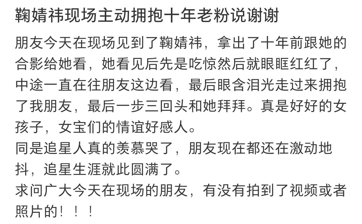 鞠婧祎主动拥抱十年老粉追剧团上一个粉丝给小鞠看了十年前的合照,小鞠特地过来拥抱她跟她说谢谢!真的要一辈子爱这个鞠婧祎了吧鞠婧祎主动拥抱十年老粉说谢谢鞠婧祎 你是不是想陷害姐姐