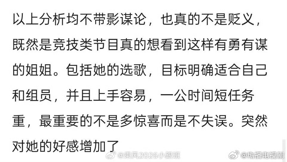 叶一茜选人叶一茜才是本季隐藏策略家!一公选人环节冷静又通透,精准搭配范玮琪、何宣林、侯宇,名气、特色、潜力全拉满,谋略在线、沟通真诚,这组未来可期!乘风2026