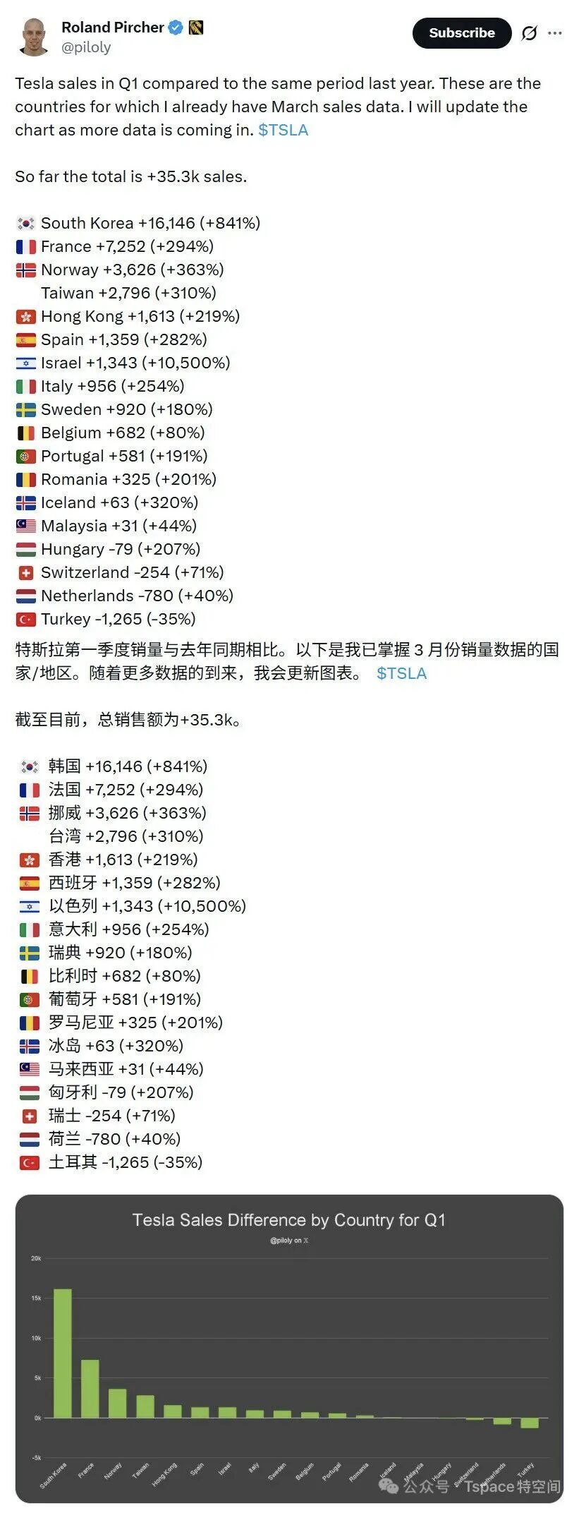 不仅在韩国,据博主“piloly”不完全统计,法国、挪威、西班牙等国家,特斯拉第一季度均取得数倍的销量增长。