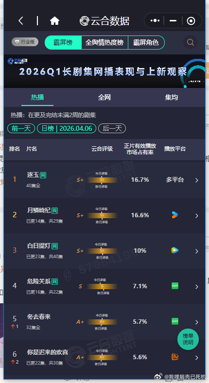 月鳞绮纪逐玉云合仅差0.1月鳞绮纪云合市占率16.7% 月鳞绮纪逐玉云合仅差0.1,月鳞绮纪云合市占率16.7%,咱就说搓搓小手期待住明天我们的月鳞绮纪登顶啦~