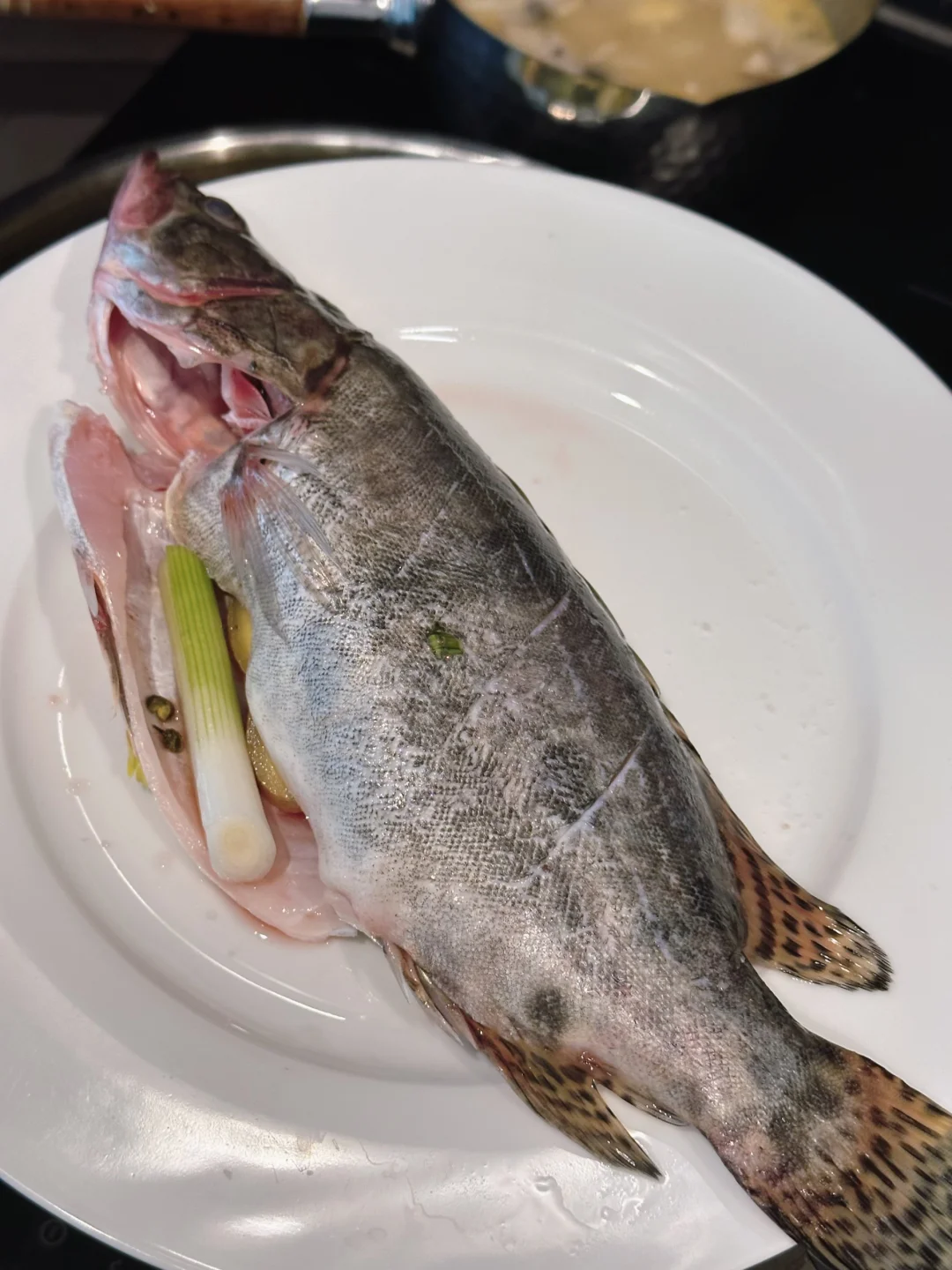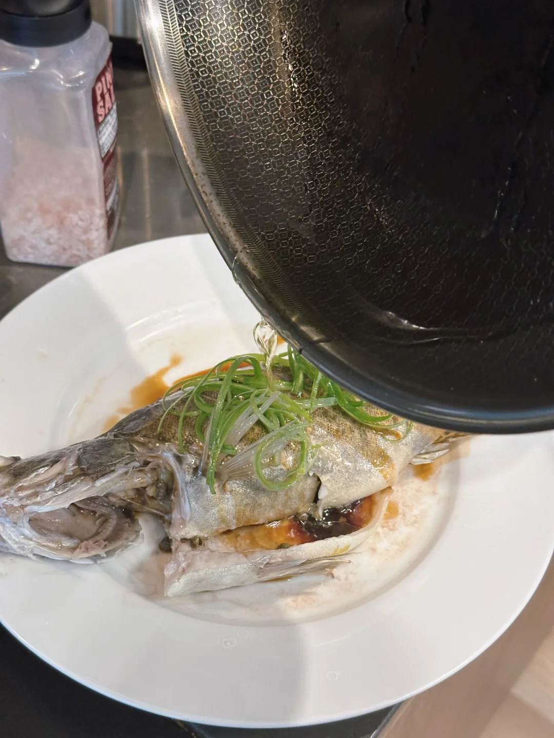 一条一磅多一点点的个头,是比较合适的大小,再大肉质反而没那么好。用最简单的方式,抹一点点盐和花椒,因为是冰冻过的,所以我还是淋了一点料酒去腥,蒸完以后浇一点蒸鱼豉油,在葱花上泼热油就完成了!