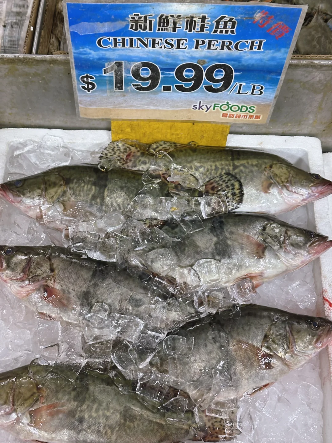 问了水产区的阿姨,说是从国内运过来冰鲜的。售价二十刀一磅,其实国内鳜鱼也不便宜,这个价格也可以接受的。