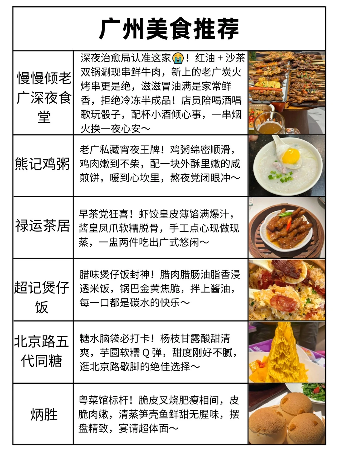 广州塔、花城广场、北京路步行街、天河城、正佳广场、太古汇、沙面岛、永庆坊、陈家祠、石室圣心大教堂、越秀公园、五羊雕像、广东省博物馆、太古仓、上下九步行街、珠江夜游码头......