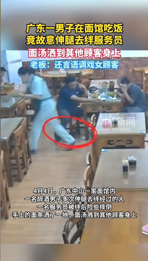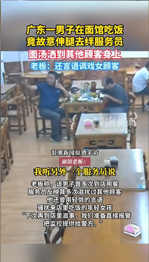 信息来源:《广东一男子在面馆吃饭,竟故意伸腿去绊服务员,面汤洒到其他顾客身上,老板:还言语调戏女顾客》浪潮新闻