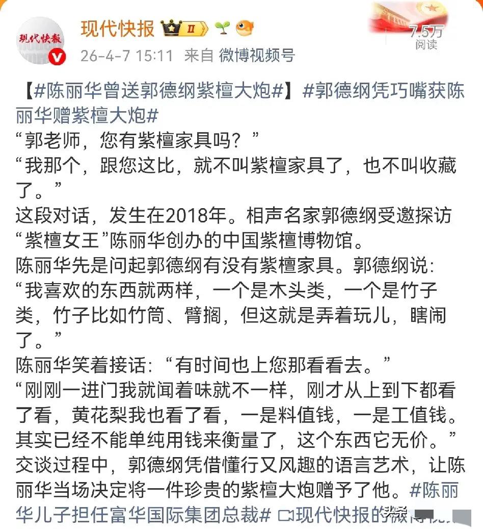郭德纲,冲上热搜! 4月7日,随着陈丽华女士离世,一段早年旧闻被翻出,瞬间引发全网热议。 2018年郭德纲到访紫檀博物馆,一进场便对紫檀、黄花梨如数家珍,几句懂行又接地气的话,瞬间说到陈丽华心坎里。能让惜宝如命的紫檀女王如此认可,可见郭德纲绝非只会说相声,对传统木器更是真懂、真热爱。 陈丽华的藏品件件价值不菲,紫檀复刻角楼更是镇馆之宝,她向来只对知己大方。郭德纲靠的不是客套,是肚里的真学问,才换来这份惺惺相惜。 真正的人脉从不是讨好,而是同频与实力。跨界相通的文化底蕴,才是最打动人的名片。 你觉得郭德纲是真懂木器,还是情商太高?
