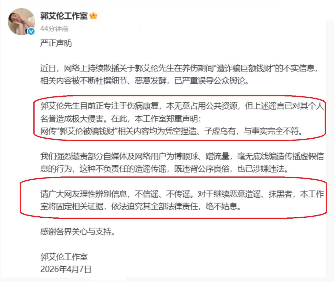 郭艾伦:我可以不追究责任,但是…… 最近郭艾伦被造谣“遭熟人诈骗近千万”这事儿,真是闹得沸沸扬扬,刷遍了全网,估计郭艾伦本人都被烦得头大,毕竟本来就还在养伤,没比赛可打,还得被这些谣言缠上。 一开始这谣言传得那叫一个真,连“熟人作案”“被骗金额近千万”都编得有模有样,不少球迷都跟着担心,甚至还有人替他出主意,怎么追回钱财。郭艾伦一开始也确实怒了,下午直接发文辟谣,说这些全是凭空捏造、子虚乌有,还放话要追究造谣者的责任。 本来大家都以为,这事儿肯定要闹大,郭艾伦说不定真要起诉造谣的人,毕竟换谁被这么冤枉、这么抹黑,都得较真。可谁能想到,没过多久就反转了,郭艾伦在回复球迷的时候,态度软了下来。 他直言,自己可以不追究那些造谣者的责任,算是网开一面了。但话里话外也带着点无奈和委屈, 吐槽说:“下一回别闹了,显得我很蠢,我是不太聪明但我没这么蠢。” 这话一出来,不少球迷都笑了,也有点心疼他。 说句实在的,郭艾伦这话也挺实在的,他不是没脾气,只是不想跟造谣的人浪费时间,毕竟现在最重要的还是养伤,备战后续的比赛。但也能看出来,他是真的被这些谣言搞烦了,又好气又好笑。 其实那些造谣的人,说白了就是为了蹭热度、博流量,根本不管会不会伤害到别人。郭艾伦松口不追责,已经够大度了,希望那些人能识相点,别再瞎编乱造了。 也希望郭艾伦能不受这些谣言影响,安心养伤,早点康复回归赛场。毕竟对于球迷来说,比起这些乱七八糟的谣言,更想看到他在球场上打球的样子,也希望他后续能顺顺利利,少被这些糟心事打扰。