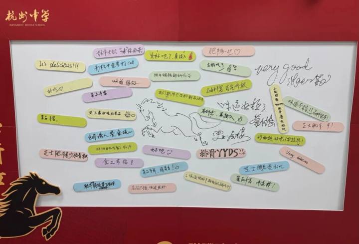 上周五的试吃会结束后,一名学生一回班级就忍不住在班里宣传:“这个焗饭夯爆了!太好吃!”连班主任都忍不住打听,这个焗饭选上了吗?什么时候能吃上?在试吃会的留言板上,也有很多学生留言:“史上最好吃的菜品”“排骨YYDS”,还有小建议:“芝士肥牛卷少放青椒”“肥牛再多一些”。
