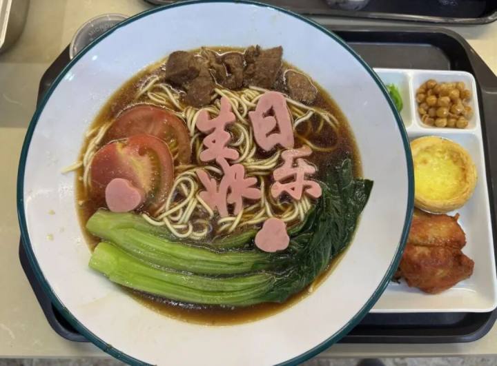 每年一次的仪式感也需要美食的助力。每周五,学校食堂还有专门的生日套餐窗口,根据学校每天播放的生日电子墙名单,确定当周生日的学生,为学生们准备生日面、小食和甜品,还会附上书记、校长的手写祝福。