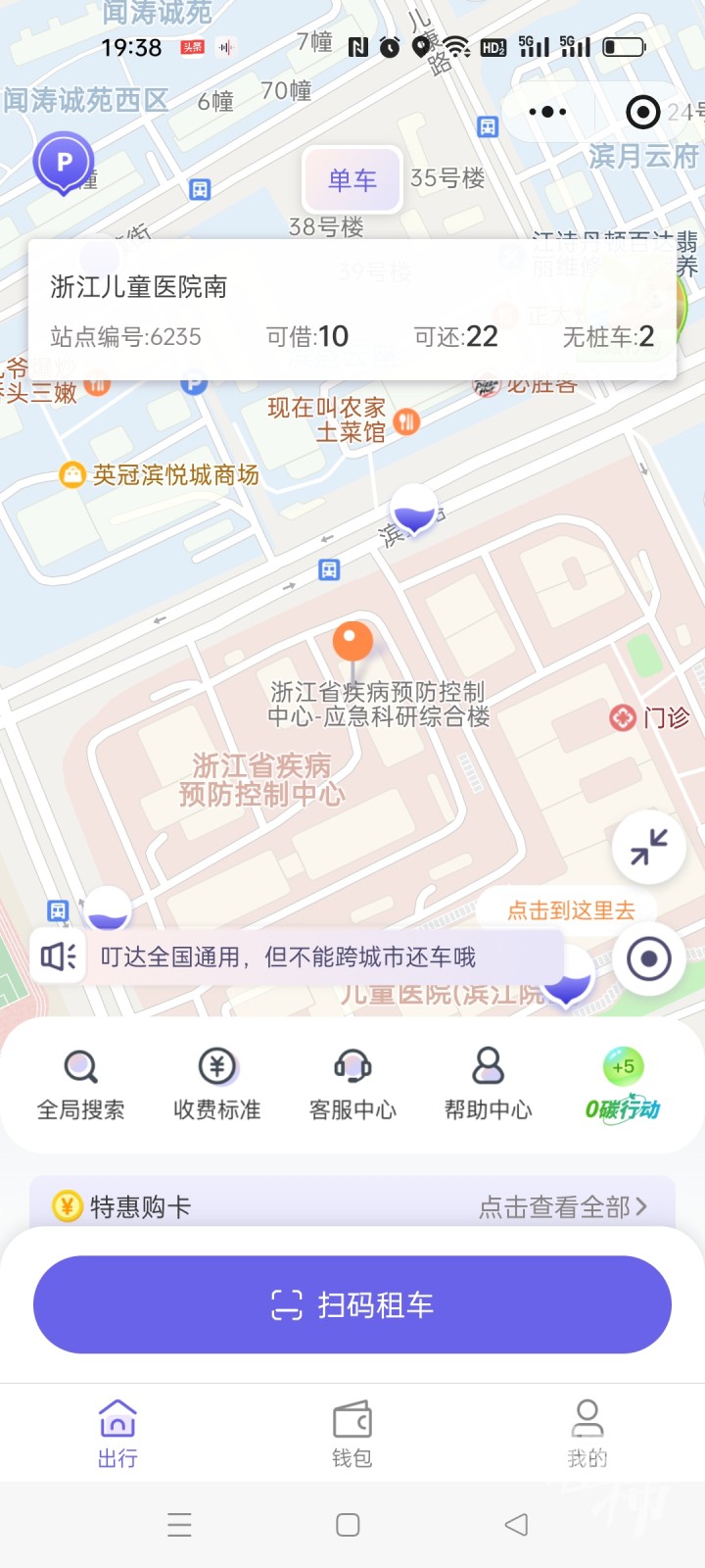 19:38,叮达出行显示“浙江儿童医院南”可借还车数