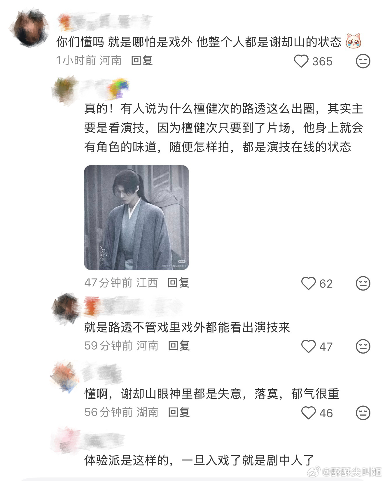 檀健次披发战损造型路透看见檀健次披发战损造型路透的那一刻对小说中“披头散发遍体鳞伤一双眼睛却亮得让人过目不忘”的描写有了实感哪怕是在戏外,檀健次看过来的那一眼,也有七分谢却山的味道,这就是体验派演员的魅力吧,一旦入了戏,就是戏中人了。。。本想说有什么冲我来,放过家主🥺🤲🏻点开评论区发现想替谢却山挨打的队伍已经从北京排到了巴黎檀健次何不同舟渡