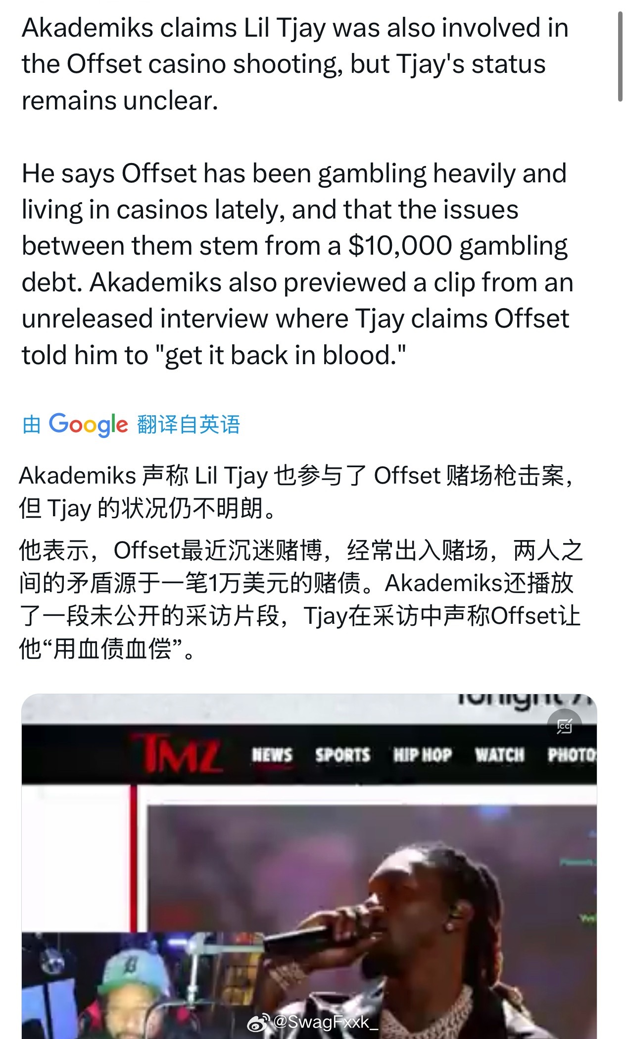 不过,虽然网传Lil Tjay参与了枪击Offset事件,但Lil Tjay的律师声明Tjay没有被指控任何枪击罪名。