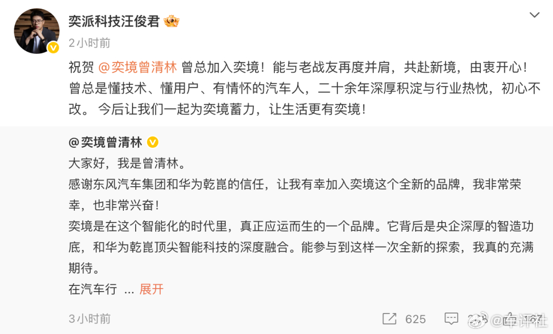 汽车人事变动 【奕境汽车正式公布核心管理层,汪俊君出任董事长】4月7日,奕境汽车正式公布核心管理层任命:汪俊君出任董事长,全方位负责东风汽车集团与华为乾崑深度融合与产品落地;曾清林出任CEO,全面主持品牌各项工作;