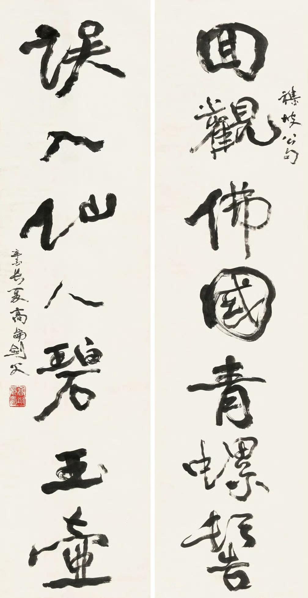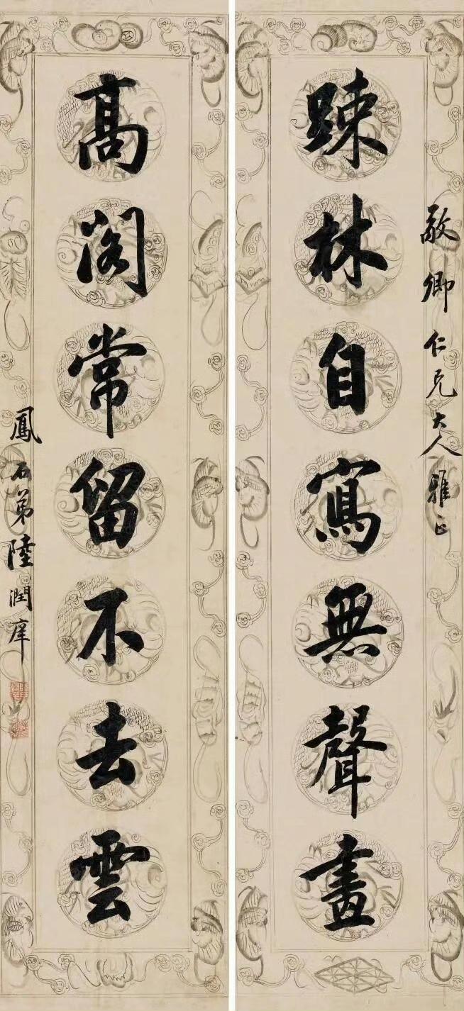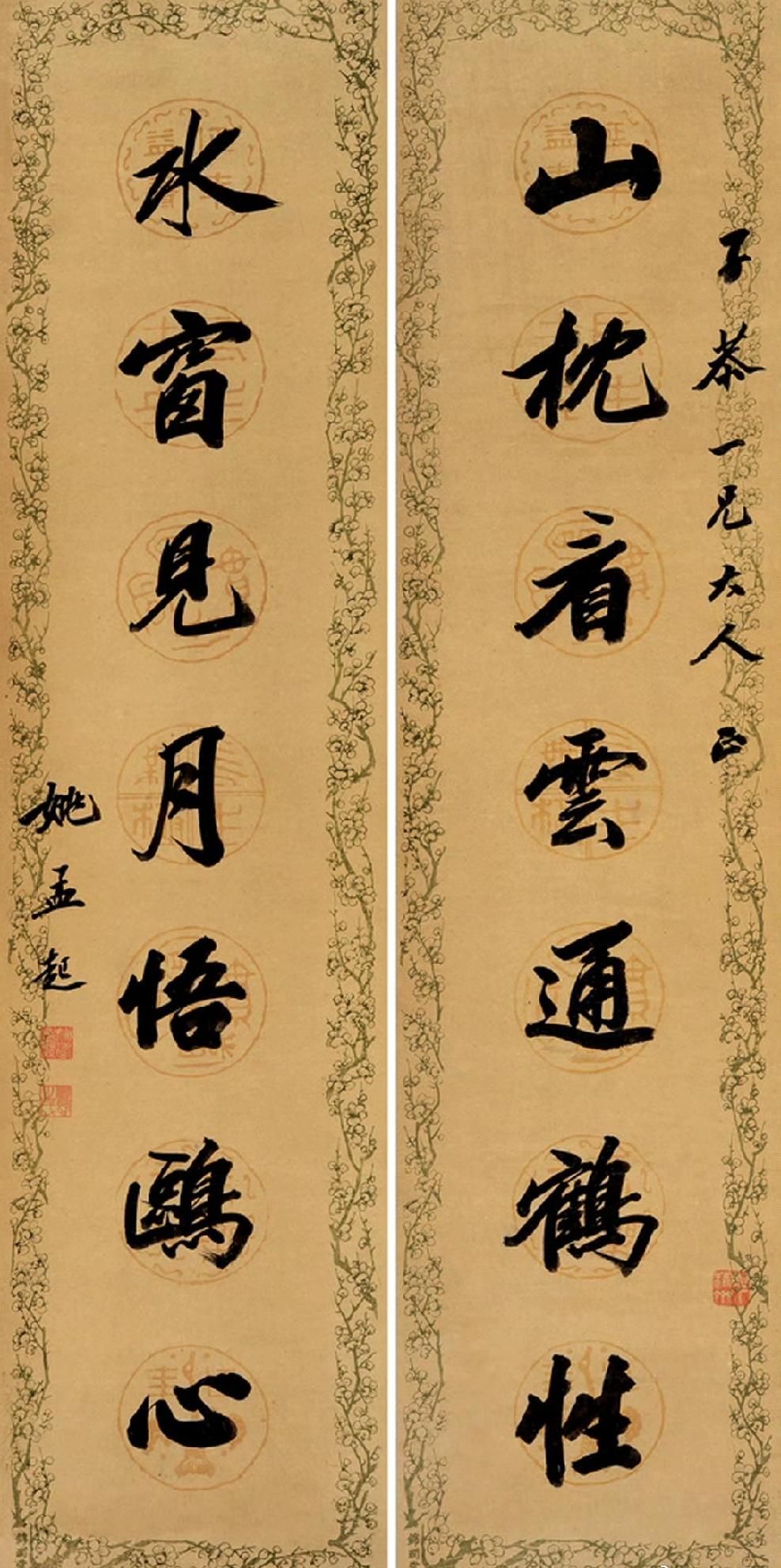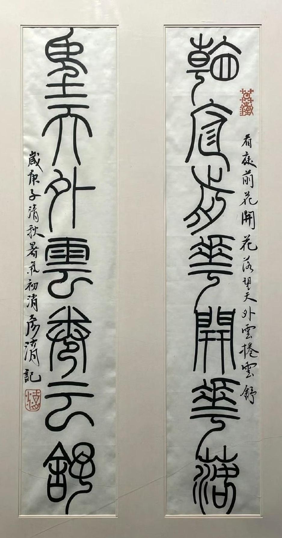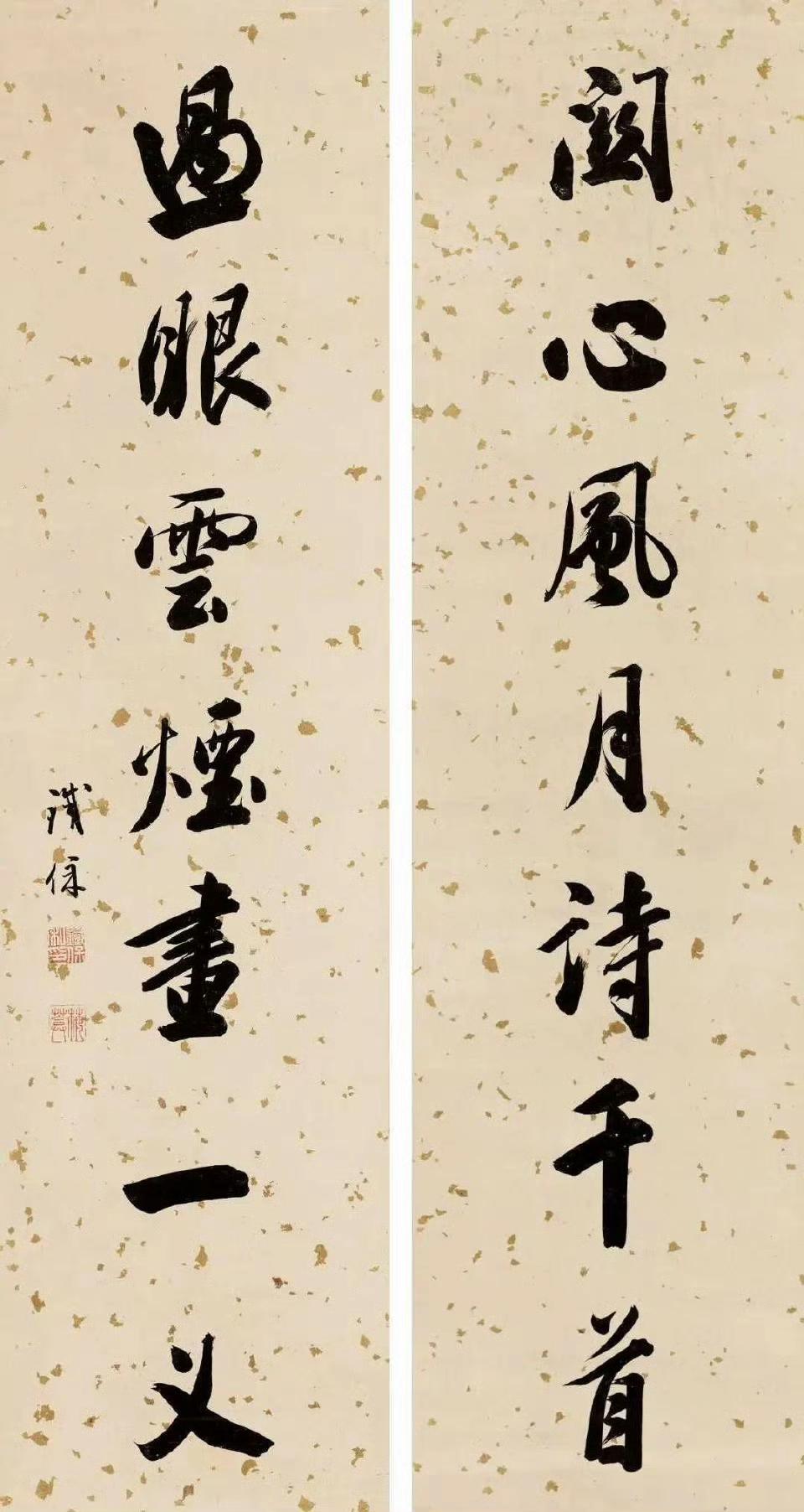 《知我知鱼未是乐,有花有酒且开眉。》 王福厂 隶书 七言联 《盛游自昔托春禊,引觞虚左期风兰 。》 赵之谦 隶书 七言联 《四面轩窗宜小坐,一湖风月此平分。》 赵少昂 草书 七言联 《自有琴书增道气,孰寻云水纵闲游。》 王澍 篆书 七言联 《疏林自写无声画,高阁常留不去云。》 陆润庠 行楷 七言联 《关心风月诗千首,过眼云烟画一义。》 铁 保 行书 七言联 《看庭前花开花落, 望天外云卷云舒。》 刘彦湖 篆书 七言联 《回观佛国青螺髻,误入仙人碧玉壶。》 高剑父 行书 七言联 《山枕看云通鹤性,水窗见月悟鸥心。》 姚孟起 行书 七言联