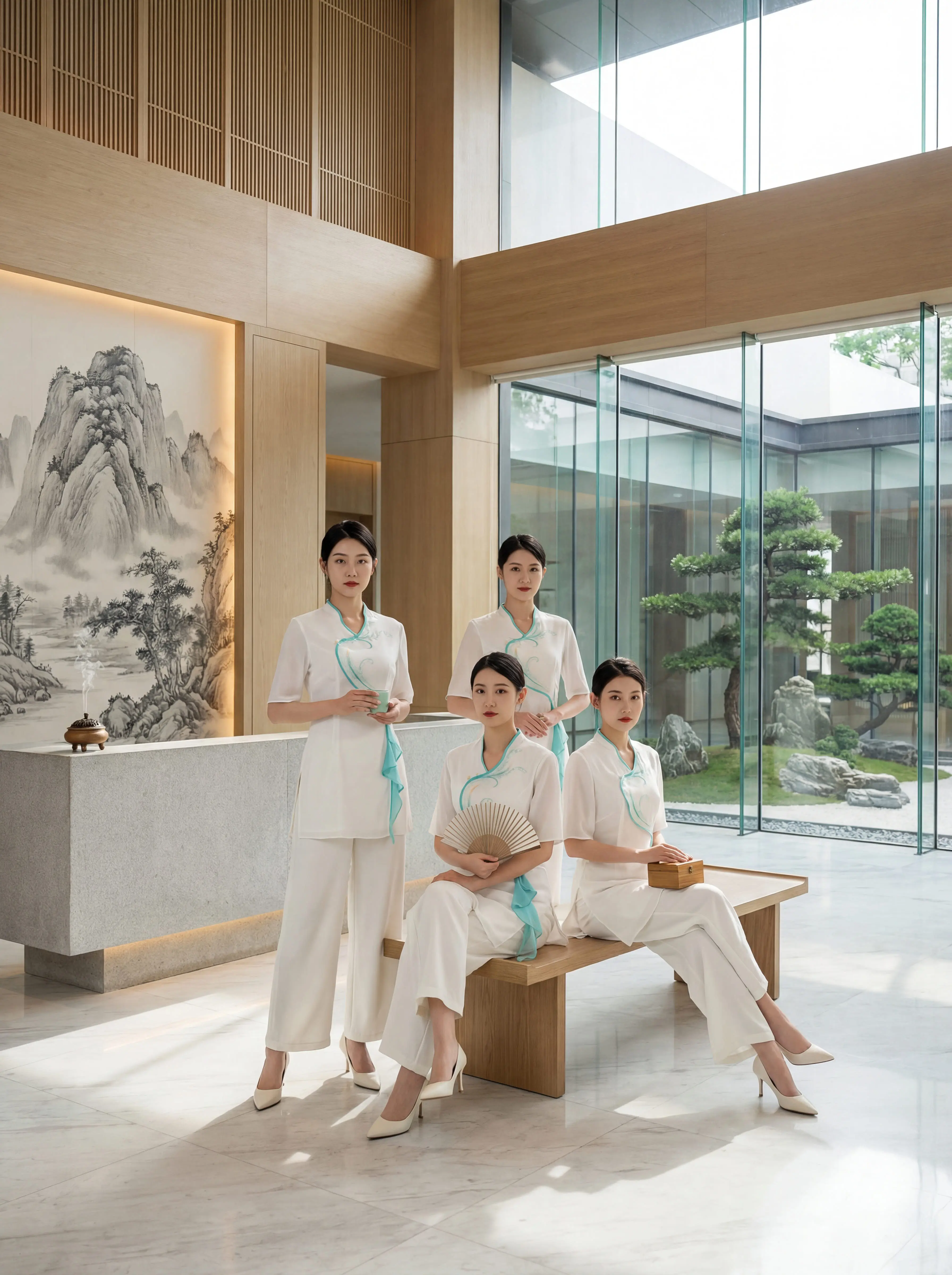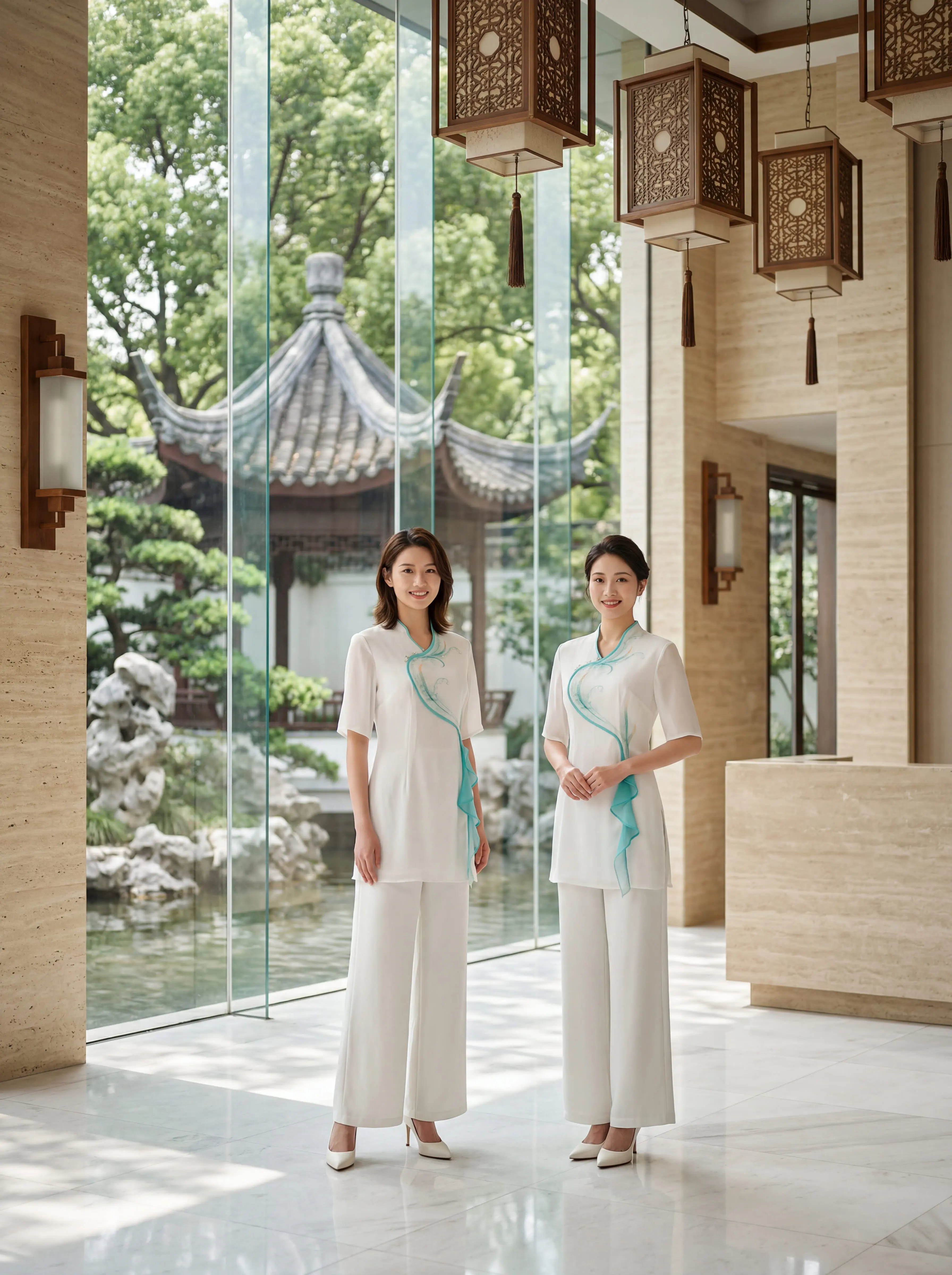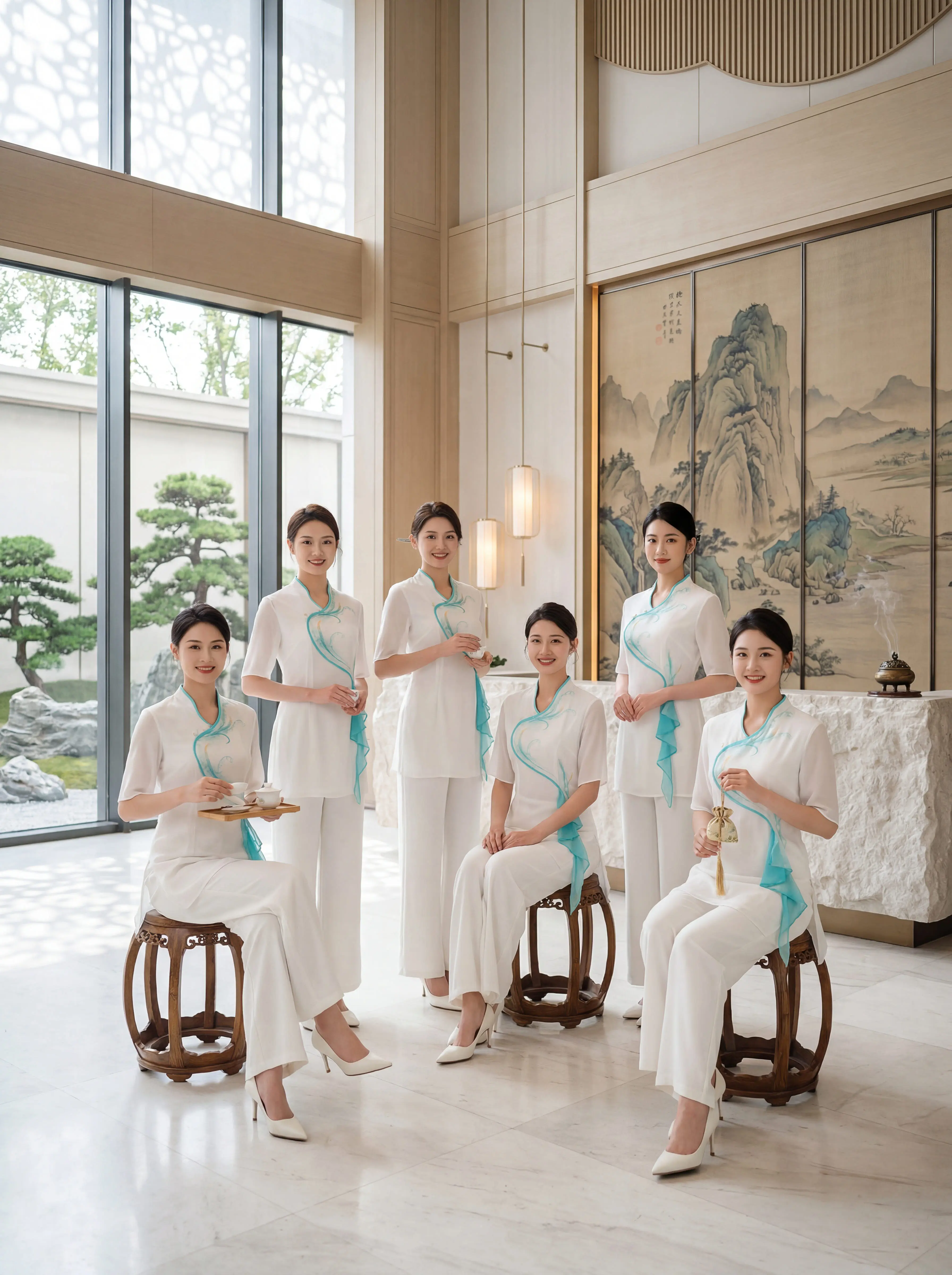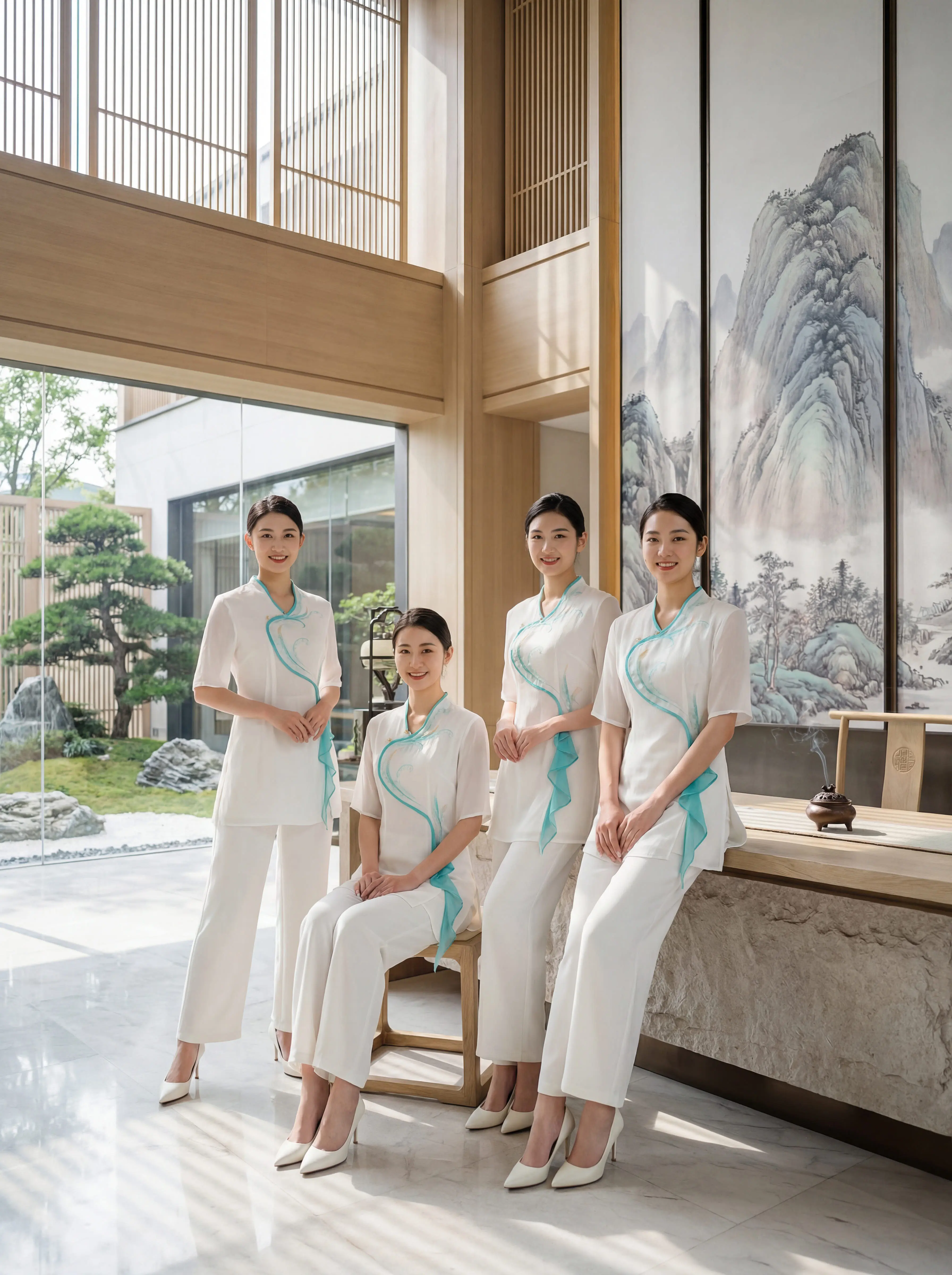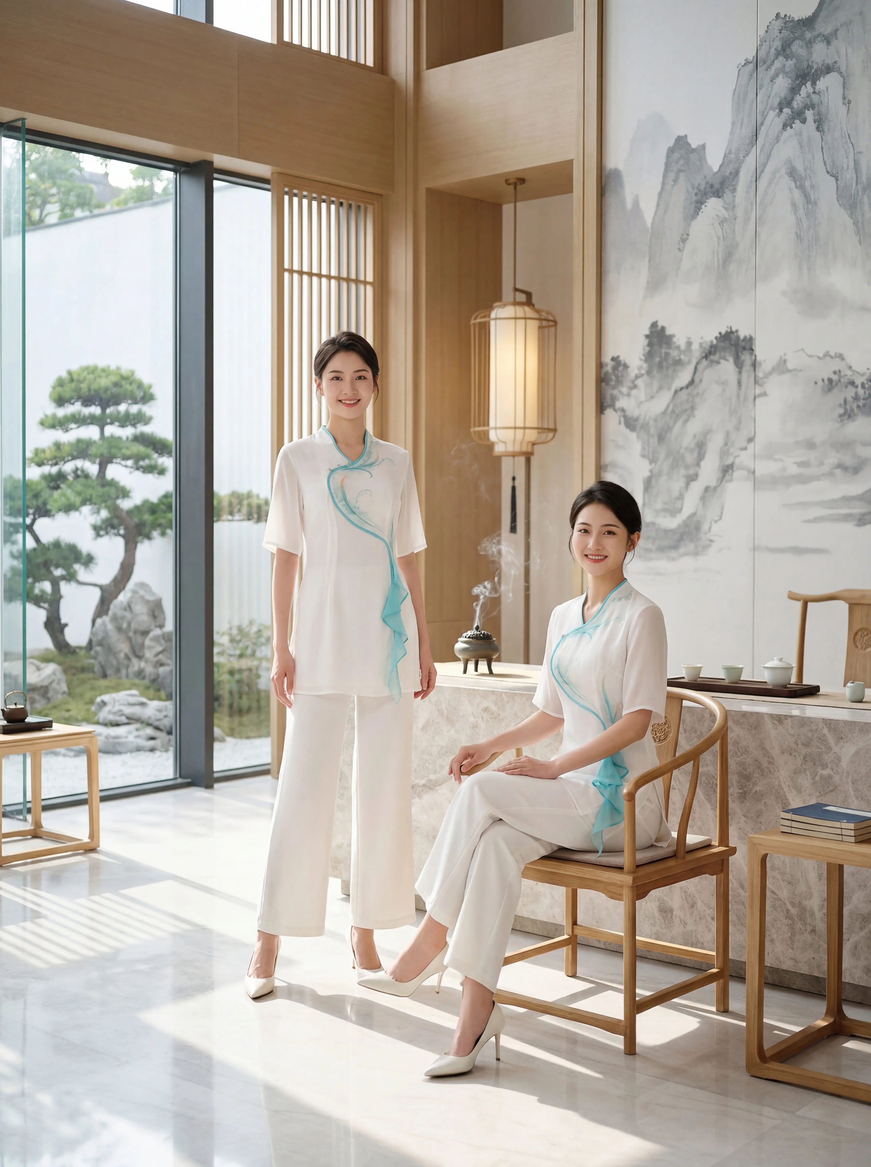 这套新中式技师服美到让人失语✨。新中式斜襟+水蓝飘带,专业又雅致 阔腿...