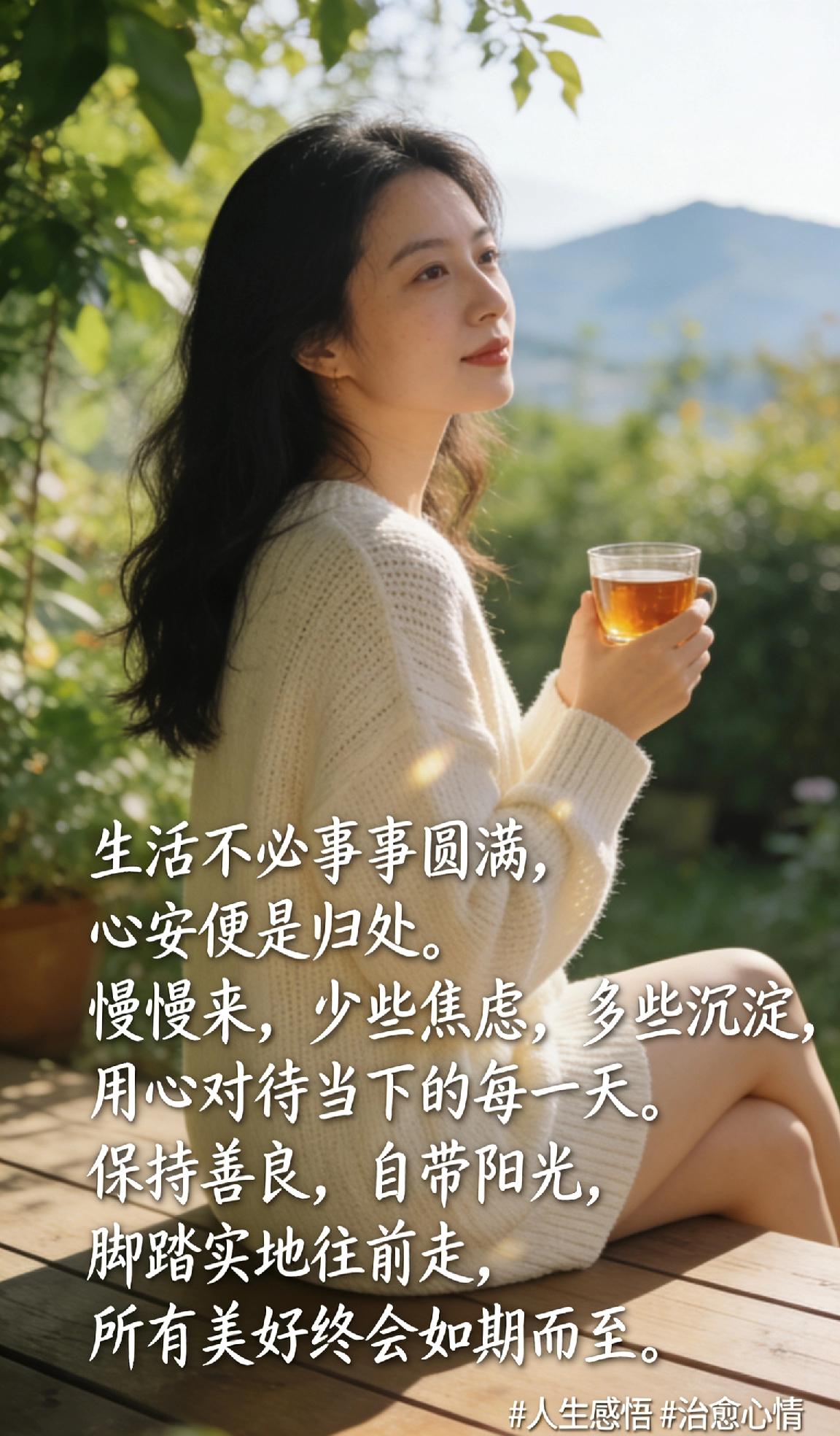 生活不必事事圆满,心安便是归处。慢慢来,少些焦虑,多些沉淀,用心对待当下的每一天。保持善良,自带阳光,脚踏实地往前走,所有美好终会如期而至。 人生感悟 治愈心情