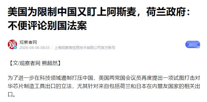 这一回中国可真要杀鸡给猴看了。 中国这次可能真要动手了,对象是荷兰。为啥是它?因为它手里有张牌,叫光刻机。 早年间,美国就以所谓国家安全为由,逼迫荷兰禁止向中国出口最尖端的EUV光刻机,让中国在7纳米以下先进制程芯片的研发上,始终面临着核心设备的瓶颈。 但美国的野心远不止于此,从2023年开始,美方不断向荷兰加码施压,要求将管制范围扩大到DUV光刻机,而荷兰也一步步选择了妥协。 2024年9月6日,荷兰正式宣布扩大光刻机管制范围,在原有管制措施的基础上,进一步收紧了相关设备的出口限制,中国商务部第一时间就此发声,对荷方此举表示明确不满。但这样的警告,并没有让荷兰停下脚步。 2025年10月31日,荷兰提前半年启动光刻机出口新规,直接将DUV设备的出口限制门槛从7纳米下调至14纳米,ASML旗下的1970i、1980i等主力中阶机型,被全面纳入出口许可证管理,审批周期最长可达90天。 更过分的是,新规不仅限制核心设备出口,连测量检测设备、计算光刻软件,甚至光刻机的原厂售后维修、固件更新服务,都被纳入了管制清单,摆明了是要从硬件到服务,全面锁死中国半导体产业的升级路径。 到了2026年3月,荷兰的管制再度升级,官方正式通告,全面终止向中国出口适用于28纳米及45纳米制程芯片制造的DUV光刻系统,同时取消所有相关设备出口许可的受理通道,这一举动,彻底打破了中荷之间半导体贸易的商业契约。 就在2026年4月,美国众议院还推出了所谓的MATCH法案,明确要求美国及其盟友在半导体技术管制上保持步调一致,核心措施之一,就是要对ASML所有浸润式DUV光刻机实施全面限制,彻底补上所谓的管制漏洞。 而ASML的供应链深度依赖美国零部件,美资的持股背景,也让这家荷兰企业,根本无法违抗美方的要求,最终只能沦为美国对华科技霸权的棋子。 面对荷兰的步步紧逼,中方从来都保持着最大的克制与沟通诚意。多年来,中荷双方就半导体出口管制问题,开展了多层级、多频次的沟通磋商,从商务部部长与荷兰外贸大臣的会见,到中国驻荷兰大使接受当地媒体专访时的明确警告,中方反复强调,荷方施行禁令会破坏中荷关系,中国“不会忍气吞声”。 中方始终希望荷方能秉持自由贸易原则与契约精神,维护全球半导体产业链的稳定,但换来的,却是荷方的一意孤行。 更过分的是,荷兰政府还以所谓国家安全为由,不当干预中资企业安世半导体的正常经营,甚至通过企业法庭作出剥夺中国企业股权的错误裁决,导致安世半导体停止向中国供应晶圆,人为制造全球半导体产业链的动荡,彻底触碰了中方的红线。 也正是在这样的背景下,中国的反制,已经箭在弦上,而这次对准荷兰,正是典型的杀鸡儆猴。 中国的反制,从来都不是意气用事,而是精准直击要害。光刻机制造离不开稀土、高纯度石英砂等关键战略材料,而中国掌控着全球90%以上的稀土加工产能,以及相关半导体核心材料的核心供应链。 2024年以来,中国多次调整稀土及相关材料的出口管制清单,虽然没有直指荷兰,但已经直接牵动了ASML的供应链神经,ASML的财务主管也在财报电话会上承认,公司不得不提前囤积库存,以防中国的进一步限制。 这张供应链王牌,只是中国反制的第一步。更让荷兰坐立难安的,是中国半导体产业的快速自主突破。2025年英国《金融时报》披露,中国芯片制造龙头中芯国际,已经开始测试国产DUV光刻机,28纳米的国产设备,已经可以通过多重曝光技术实现7纳米芯片的生产。 这意味着,荷兰手里的光刻机王牌,正在快速贬值。等到中国实现光刻机技术的全面自主可控,就算荷兰的设备再便宜,中国也不会再买,到时候荷兰失去的,将是整个全球最大的半导体消费市场。 而这次选择拿荷兰开刀,更深层的意义,就是要给所有跟风美国对华围堵的国家,敲响一记警钟。美国一直想要打造一个对华科技封锁的联盟,拉着日本、韩国、欧盟各国一起动手,而荷兰就是这个联盟里的关键一环。 精准反制荷兰,就是要清清楚楚地告诉所有国家:不要指望能一边赚着中国市场的钱,一边拿着技术武器砸中国的碗。任何跟随美国对华实施无理技术封锁的行为,都必然要付出实实在在的经济代价。 荷兰如果继续执迷不悟,最终只会沦为美国科技霸权的牺牲品。而中国突破技术封锁、实现科技自立自强的脚步,永远不会停下。