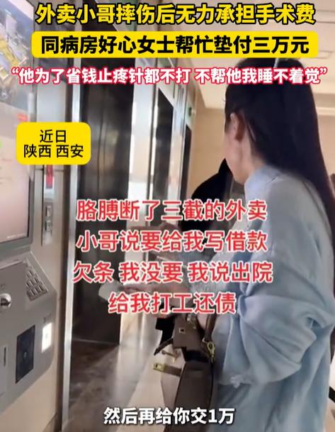 看哭了!2025年3月陕西西安,女子在母亲的病房,看到同病房的外卖小哥,胳膊断了三节,手术费大概5万元,为了省钱,他竟然跟医生说不打止痛做手术,后来他又打电话给家人和亲戚借钱,可只借到15,000元,他很无助,如果15天之内不动手术,他的手就废了,女子看到了,心里很不是滋味,就帮他交了3万元,事后她母亲还说:你一定要给他留下钱,女子又给他留了1000元的伙食费,女子说:如果我不帮他,我会睡不着觉的。